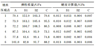 如图4所示:A样品为钢板样品,不同锈蚀深度压痕点对应的位移-荷载曲线线型及测试数据范围基本一致,表明钢板的锈蚀产物较为均匀;在B、C类混凝土中钢筋锈蚀产物样品测试结果中,除B1样品压痕点5和B2样品压痕点4之外,其他压痕点的位移-荷载曲线可以保持较高的一致性。这表明在长期海洋环境作用下,混凝土中钢筋锈蚀产物稳定性、均匀性均处于较高水平,利用纳米压痕表征钢筋锈蚀产物力学性能的可行性较强,测试的力学特征参数数据具有较高的参考价值。