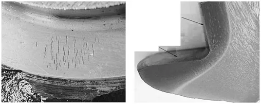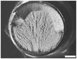 断裂源附近的断面主要为沿晶断裂,呈冰糖 状,无明显塑性变形,还有少量韧窝。各晶粒之 间分布有许多二次裂纹,属脆性断裂 |
