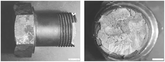 如何快速、准确地查找失效原因,并提出切实可行的改进措施及建议,进而完善装备,确保和提高装备的质量和可靠性,从而达到预测和预防机械装备失效的目的,是失效分析工作者的不懈追求。今天给大家分享《失效分析150》这本书中的两个典型的案例失效背景:在20余台重载履带车辆共6000多个端联器螺栓中有3个螺栓断裂,失效率 为0.044%。失效螺栓均是在使用初期断裂,见图1-1,螺栓断面形貌见图1-2。图1-1的失效螺栓是一条新履带装车行驶1km后停车维护时,出现突然断裂。螺栓头部一段从端联器中间的光孔中掉落,有螺纹的另一段残留在端联器上的螺纹孔中。螺栓的服役条件在静止时受预紧静拉力,运动时受预紧静拉力加交变切向力。失效特征:从图1-2螺栓断裂面看出,断口呈起伏状,无塑性变形,个别区域有面积大小不等的小平面,整个断面上无冶金缺陷。断裂源只有一个,起始于断面外侧的螺纹根部应力集中处,断裂源宽约1mm,在半径2mm内的区域内较平坦,断裂源两侧10mm外的其余断面外圆处有1mm左右的拉边,断面主要由沿晶、冰糖状、大量的晶间微裂纹组成,整个断裂面上各个小平面之间没有显著的分界线,也没有疲劳断裂中的贝纹线,呈现出典型的无塑性脆性断裂形态。综合分析:理化检测的化学成分、非金属夹杂物、晶粒度及热处理质量的结果表明,原材料、螺栓制造质量均满足技术要求。螺栓的基体金相组织见图1-3,微观扫描断口形貌见图1-4。查找生产作业,发现当初螺栓拧紧装配时,实际拧紧力矩远大于设计规定的力矩。为对比分析,取9枚螺栓实物(8枚已使用无问题的螺栓,1枚未使用螺栓),进行强断拉伸试验。螺栓拉伸试验断口的断裂源也同样位于一侧螺纹根部应力集中处,属于线断裂源,断口形貌平齐,见图1-5。断口微观形貌见图1-6。两种断口形貌对比见表1-1。