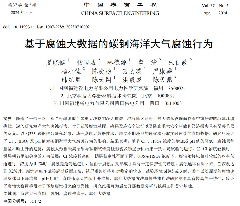 北京科技大学腐蚀控制系统工程研究所在《中国表面工程》2024年第2期发表研究论文《基于腐蚀大数据的碳钢海洋大气腐蚀行为》,以 Q235 碳钢作为研究对象,基于腐蚀大数据技术,通过周期浸泡加速试验获取实时连续的腐蚀数据,研究环境因子 Cl−、HSO3−及 pH 值对碳钢海洋大气腐蚀行为的影响。