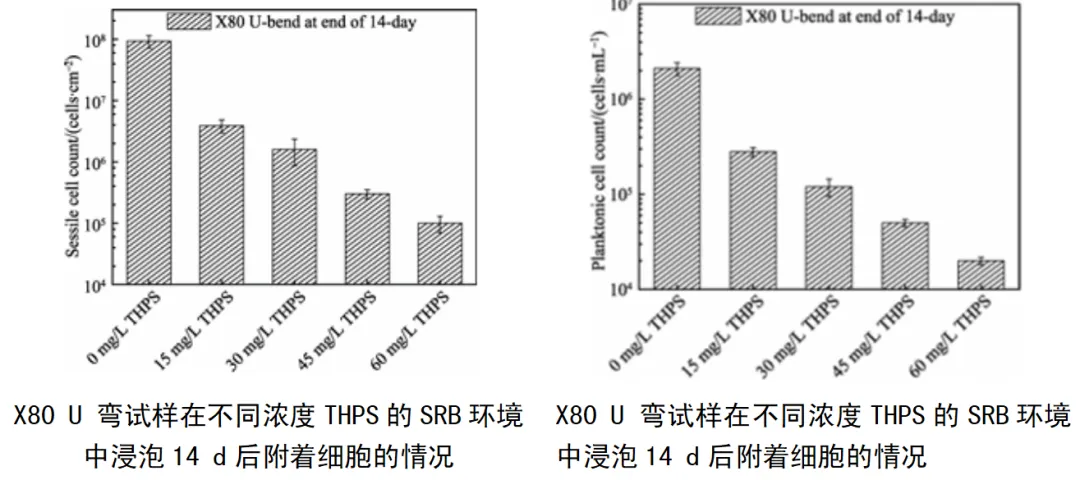 1)60 mg/L THPS 可以基本抑制D. vulgaris 生长(缓蚀率达到97%),有效抑制X80钢发生微生物引起的应力腐蚀开裂。2)从细胞计数、荧光染色和腐蚀产物成分测定的结果可得出,THPS的加入,对游离细胞、固着细胞和生物膜都具有良好的杀灭和驱散作用,并溶解掉腐蚀产物 FeS 和 FeS2,从而显著降低了固着细胞和X80 表面之间的胞外电子转移过程(EET),有效降低了MIC的速率。3)从裂纹形貌电镜照片可得出,随着加入的THPS 浓度逐步升高,放慢的MIC速率会形成体积较小的点蚀坑。D. vulgaris SRB 造成的X80 U弯试样的裂纹形貌,会随着THPS的初步加入变得更加狭窄细长。随着加入的THPS浓度的进一步升高,D. vulgaris 造成的点蚀进一步缩小到近乎消失。形成裂尖的条件因此受限,应力腐蚀开裂现象也得到了缓解。4)随着THPS的加入,封闭体系中的H原子的量会随着THPS浓度升高而减少。较少的H原子会降低裂尖承受的压力,导致裂纹生长变慢,裂纹长度进一步降低。5)THPS 在 X80 钢的表面吸附类型,既存在由于THPS和X80钢表面之间的静电效应造成的物理吸附,也存在THPS和X80钢表面之间的电荷交换造成的化学吸附。