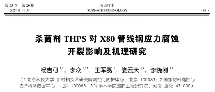 引文格式:杨吉可, 李众, 王军磊, 等. 杀菌剂THPS对X80管线钢应力腐蚀开裂影响及机理研究[J]. 表面技术, 2024, 53(20): 69-81.