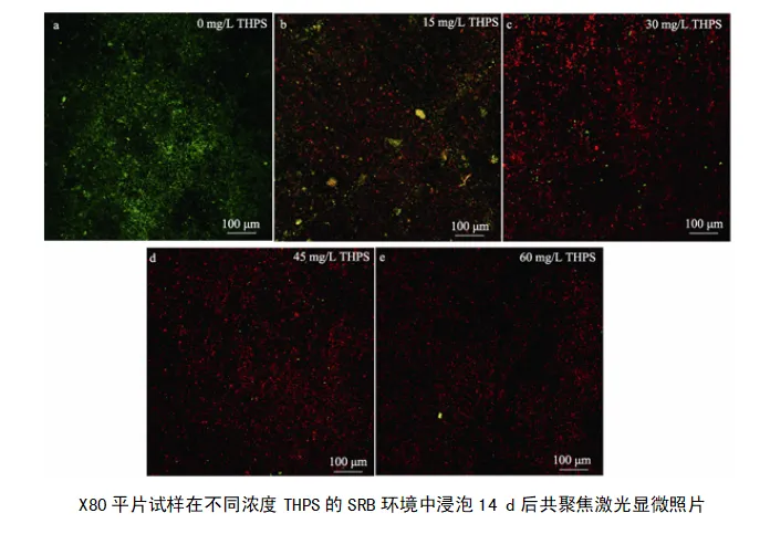 由于激光共聚焦荧光显微镜(CLSM)更方便对平面的试片进行观察,所以试验之初,在厌氧瓶里共同浸泡了若干X80平片试样,以便对D. vulgaris菌在不同浓度的THPS的环境里的生存状况进行表征,结果如图8所示。由图中可以看出,未注入任何THPS的条件下(图8a),X80平片试样的表面活细胞最多,大量细胞和生物膜附着在试片表面。随着THPS浓度升高,呈现出绿色的活细胞逐渐减少,呈现出红色的死亡细胞逐渐增多,说明THPS对D. vulgaris菌具有杀灭作用,趋势与附着细胞计数结果(图4)相一致。但是,THPS的质量浓度升高到了60 mg/L后,也依然有少量D. vulgaris 菌存留于表面(图8e)。据其他研究结果表明[23],SRB 的另一亚种菌株 D. ferrophilus 在 50 mg/L THPS 下已经被杀灭的很干净,说明D. vulgaris 虽然比D. ferrophilu 腐蚀性较弱,但并不能被轻易地杀灭干净。
