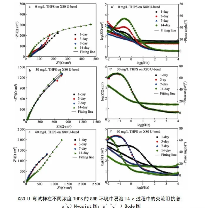 图10 是 X80 U 弯电极在不同浓度THPS的 D. vulgaris 菌的培养液浸泡14 d中的能奎斯特图和波特图。整体而言,D. vulgaris菌的培养液被注入THPS的能奎斯特图(图10b~c)半圆弧直径和波特图中对应的模值log|Z|都比未注入THPS的(图 10a)大,说明THPS能有效抑制微生物腐蚀活动,抑制生物膜在电极表面附着,从而导致腐蚀活动减缓。其中,未注入THPS时,第1天的阻抗弧最大。随着D. vulgaris菌活动旺盛,导致阻抗弧逐步降低,并且随着腐蚀产物在表面堆积,出现了扩散现象。注入THPS后,腐蚀产物较未注入THPS有所减少,扩散现象消失并且阻抗弧和模值log|Z|均变大。