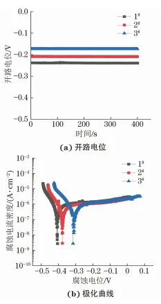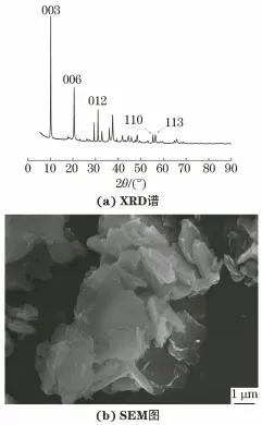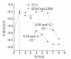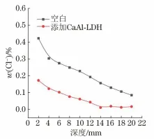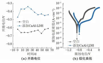 1. 1 CaAl-LDH制备与表征 CaAl-LDH材料采用共沉淀和离子交换技术制备,具体工艺如下:分别配制0.4mol/LCa(NO3)2溶液200mL、0.2mol/LAl(NO3)3溶液200mL和1mol/LNaNO2溶液100mL,将配制好的Ca(NO3)2和Al(NO3)3溶液混合,并磁力搅拌10min;将混合液逐滴加入到NaNO2溶液中,搅拌30min后,采用稀硝酸和氢氧化钠调节混合液的pH至9,继续搅拌24h;采用离心机对混合液进行多次离心,并用去离子水清洗,将获得的沉淀物干燥即可得到CaAl-LDH。分别采用 X射线衍射仪(XRD)和扫描电镜(SEM)分析观察CaAl-LDH结构和形貌。 1.2 钢筋混凝土试块制备 钢筋混凝土试块中水泥采用粤秀P·II42.5R型硅酸盐水泥,砂为标准砂,CaAl-LDH掺量为2%(质量分数) ,并以不惨CaAl-LDH的空白样作为对照试块。为保证CaAl-LDH在混凝土中均匀分散,将CaAl-LDH颗粒研磨,过筛(孔径6.5μm)去除大颗粒,边搅拌边将CaAl-LDH缓慢掺入到水泥砂浆中,并继续搅拌10min,最后一起混合搅拌成型。钢筋混凝土试块中钢筋材料为Q235钢。3根钢筋沿混凝土外侧向内间隔1.5cm排布,成形后钢筋混凝土试块为圆柱体(ϕ20cm×15cm),如图1(a) 所示。混凝土强度等级为C40。 1.3 抗氯盐侵蚀性能测试 为了评价CaAl-LDH的抗氯盐侵蚀性能,在空白和掺入CaAl-LDH的模拟混凝土孔隙液中测试了钢筋的开路电位和极化曲线。模拟混凝土孔隙液为饱和Ca(OH)2+0.05mol/L NaCl溶液,CaAl-LDH掺量为2g/L。测试仪器为Parstst2273电化学工作站,同时采用三电极体系:钢筋为工作电极、 铂电极为辅助电极、饱和甘汞电极为参比电极。极化曲线测试区间为-150~+750mV(相对于开路电位),扫描速率为1mV/s。 1.4 耐久性评估 模拟海洋环境对钢筋混凝土试块进行加速腐蚀试验,即将试块在165g/LNaCl溶液中浸泡3个月。然后,同样采用电化学工作站和三电极体系对混凝土试块中不同深度的钢筋进行电化学测试。其中,电化学阻抗谱以开路电位为平衡电位,频率范围0.01~100000Hz,扰动电位为±10mV。 参考JGJ/T322-2013《混凝土中氯离子含量检测技术规程》检测混凝土中氯离子渗透含量。先采用自动磨粉机对样品进行分层磨粉,然后将各层磨粉溶解于水中,并采用电化学自动滴定方法测其氯离子含量,如图1(b)所示。 图 1 试验装置示意