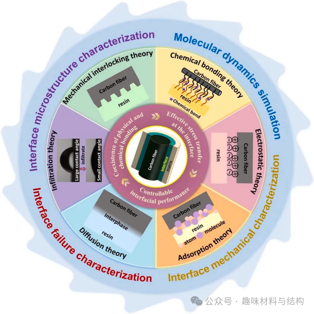 对于给定的基体和增强体系,界面的结构和性能是影响复合材料整体性能的决定性因素。因此,复合材料界面行为的研究往往成为复合材料领域的核心问题。对于以增强为目的的复合材料,通过赋予纤维表面新的化学或物理性质以与基体形成更强的结合,寻求各种方法来加强纤维与基体之间的结合。此外,通过改变基体组成和加工工艺,可以对CFRP界面进行修改和设计,使材料具有优异的性能,从而得到广泛的应用。