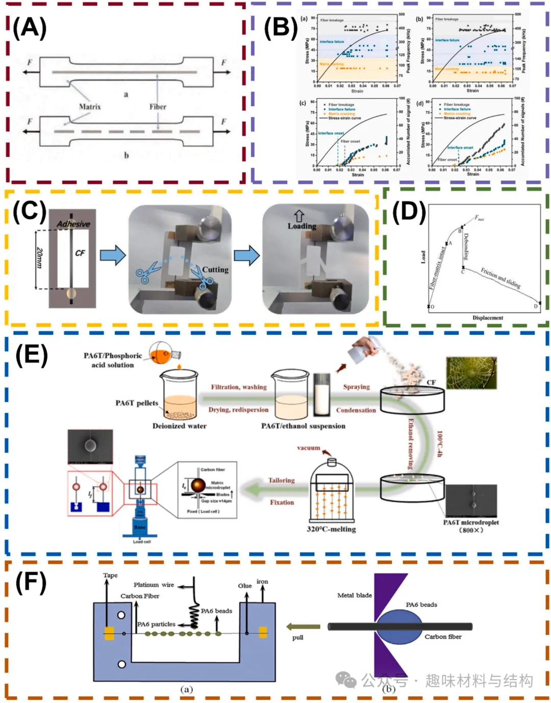 微滴脱粘试验:单丝CF/ PA6微滴复合材料制备示意图及微粘测试;