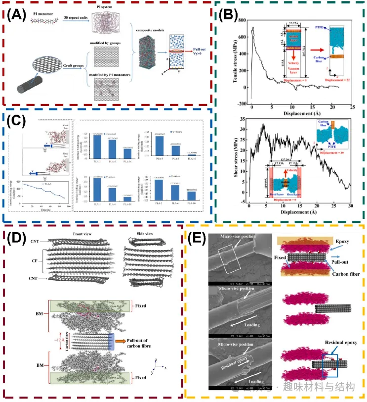 MD模拟通常使用大规模原子/分子大规模并行模拟器(LAMMPS)进行。MD模拟提供了微观结构变化和分子相互作用的详细信息,由于局部碳纤维/环氧树脂界面的纳米级尺寸,在实验中难以捕捉到这些信息,因此越来越多地用于研究纤维与基体之间的界面行为。