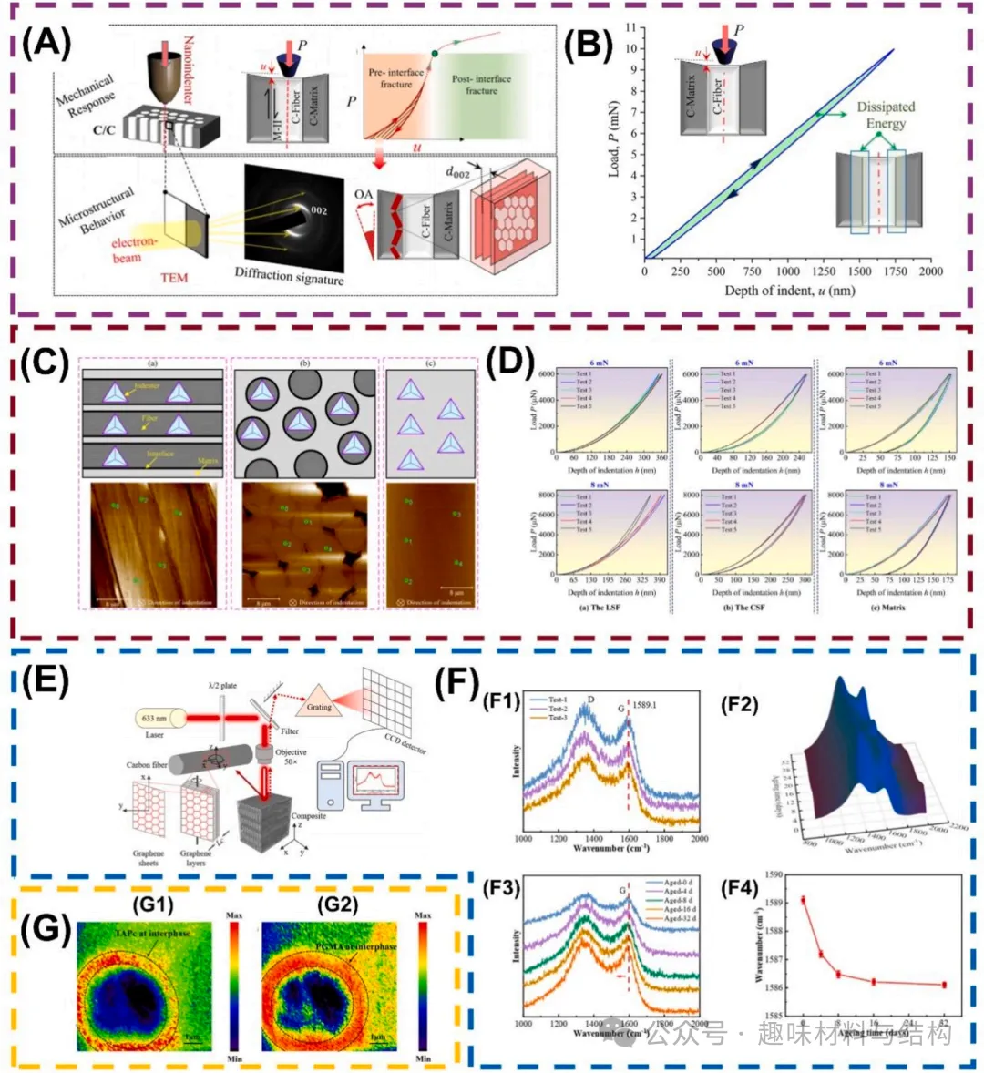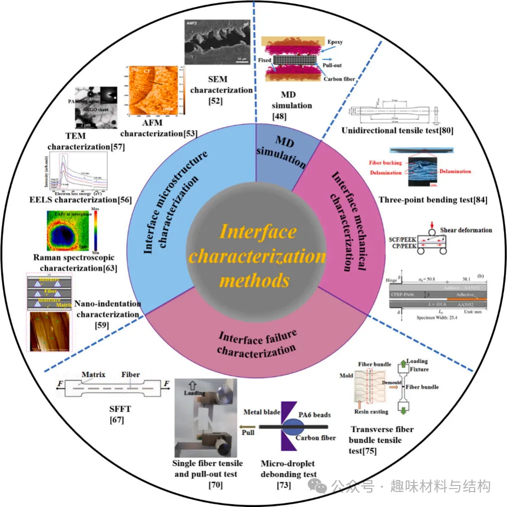 CFRP复合材料中,界面是决定其力学性能的关键因素。显微组织、化学成分、力学特性、CFRP界面的强化机制导致了相似纤维-基体系统界面性能的差异。不同的复合材料界面行为多样而微妙,需要系统多层次的界面表征技术进行综合分析。依靠分子动力学模拟、界面微观结构、界面破坏特征、复合力学性能这些界面表征技术,可以有效地研究纤维-基质界面的形态演化、化学成分和微观力学特征,为研究界面复杂的物理化学性质提供基础。