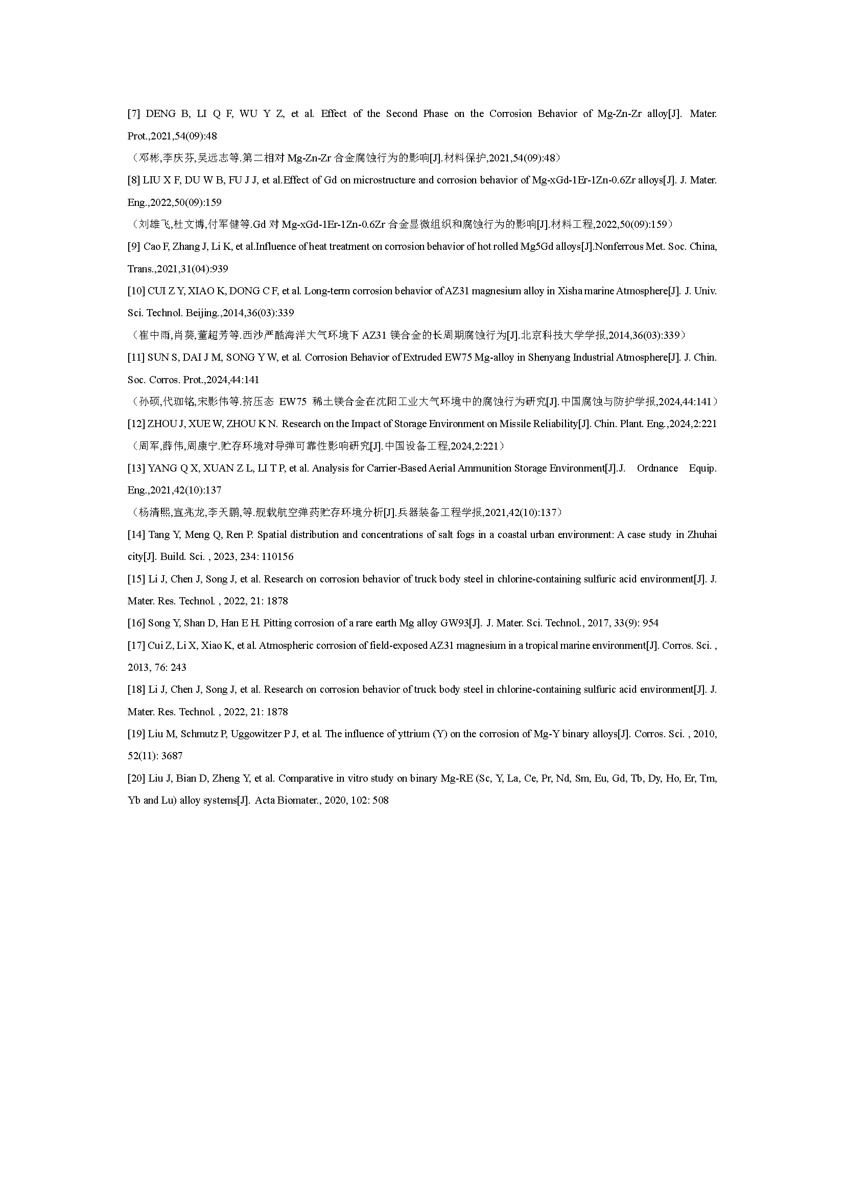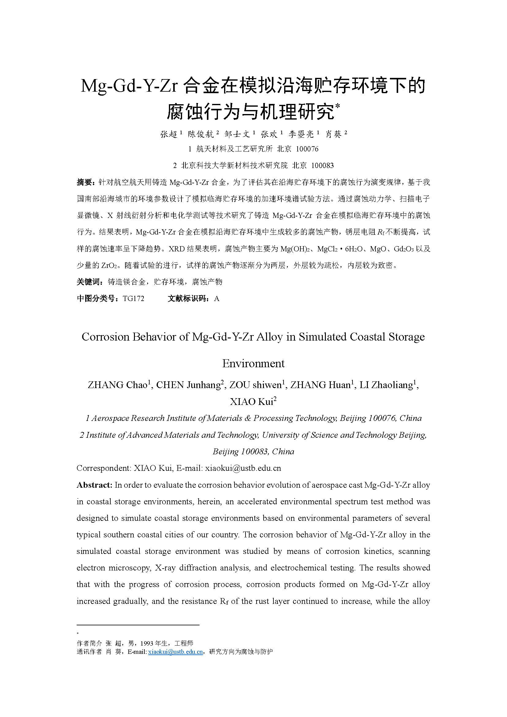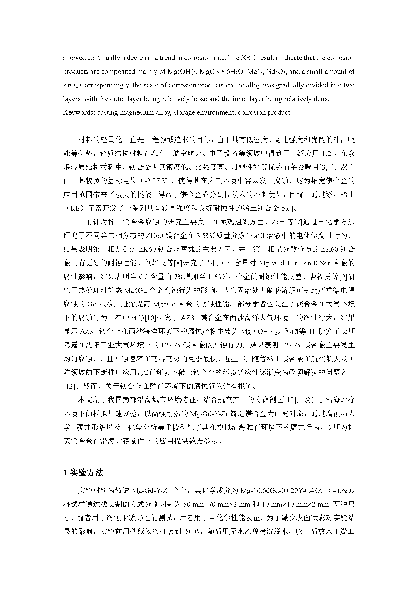 Mg-Gd-Y-Zr合金在模拟沿海贮存环境下的腐蚀行为与机理研究