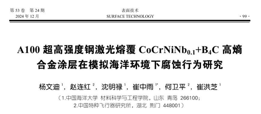 第一作者:杨文迪 通讯作者:崔中雨副教授 第一作者单位:中国海洋大学 DOI:10.16490/j.cnki.issn.1001-3660.2024.24.009 基金项目:中央高校基本科研业务费(202241012,202262011);山东省优秀青年基金(ZR2022YQ44) 背景与意义: 中国海洋大学崔洪芝教授团队设计不同B4C含量的高熵合金涂层,探究了B4C含量对CoCrNiNb0.1+B4C高熵合金涂层显微组织的影响,分析了不同B4C含量的涂层在模拟海洋环境下的腐蚀行为。为拓展A100钢在海工装备中的实际应用提供理论参考。 【关键词】CoCrNi基高熵合金涂层;激光熔覆;海洋腐蚀 杨文迪, 赵连红, 沈明禄, 等. A100 超高强度钢激光熔覆 CoCrNiNb0.1+B4C 高熵合金涂层在模拟海洋环境下腐蚀行为研究[J]. 表面技术, 2024, 53(24): 99-109. YANG Wendi, ZHAO Lianhong, SHEN Minglu, et al. Corrosion Behavior of CoCrNiNb0.1+B4C High Entropy Alloy Coating on A100 Ultra-high Strength Steel by Laser Cladding under Simulated Marine Environment[J]. Surface Technology, 2024, 53(24): 99-109.