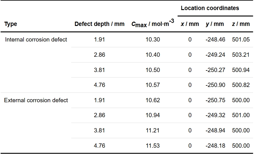 由图13可得,在5 × 106 s时在10 MPa下具有不同深度(长度为16 mm)的内部和外部腐蚀缺陷处的氢分布。颜色图例为氢浓度(mol/m3)的大小。如图13a~d所示,在1.91 mm深度处,腐蚀缺陷处的氢浓度为深红色略高于其他部位。当深度增加到2.86 mm及以上时,缺陷处的氢浓度在浓度棒上呈暗红色表示为浓度最高,并且氢积累区域变得大于1.91 mm处。从图13e~h中可以看出,当缺陷深度为1.91 mm时,氢在缺陷处不会明显地积聚,如浓度条上的黄色所示。由此可得,随着缺陷深度的逐渐增加,外腐蚀缺陷处的局部氢浓度逐渐升高,依次出现橙、红、暗红3种颜色。表3中列出了不同缺陷深度处的最大氢浓度和位置坐标。