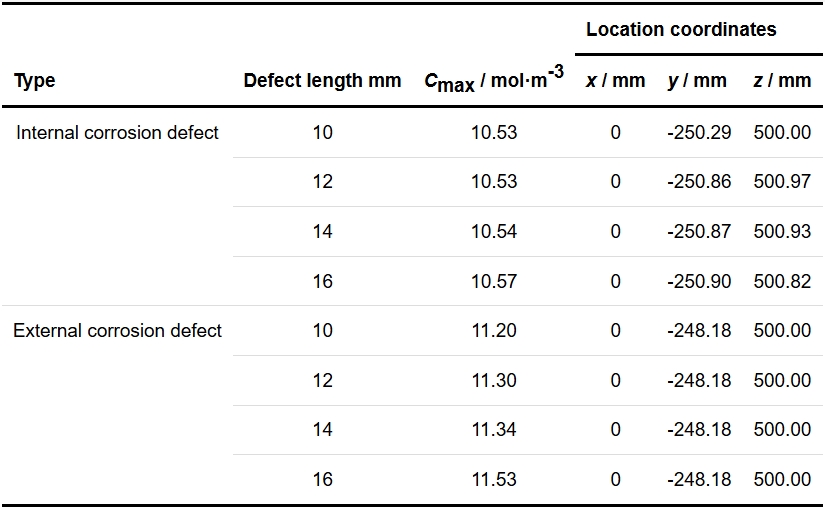 图12为在5 × 106 s时10 MPa下具有不同长度(深度为4.76 mm)的内部和外部腐蚀缺陷处的氢分布。颜色图例为氢浓度(mol/m3)的大小。从图12a~d可以看出,当长度为10 mm时,氢在内腐蚀缺陷处有明显聚集,浓度条上以暗红色表示,且缺陷处暗红色浓度仅随长度增加而略有增加。当缺陷长度为12 mm时,缺陷处的氢浓度在浓度条上为浅红色,表示为较高氢浓度。如图12e~h所示,不同长度的外腐蚀缺陷处的氢积累也很明显,当缺陷长度从10 mm增加到16 mm时,浓度条上的氢浓度由红色变为暗红色,表示为浓度增加。由此可得,随着缺陷长度的增加,氢的聚集区域扩大。不同缺陷长度下的最大氢浓度和位置坐标列于表2中。