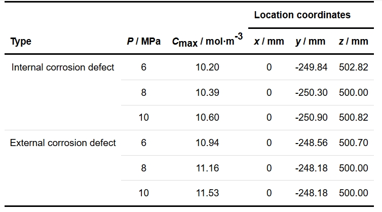 (2) 在相同内压下,外腐蚀缺陷处的氢浓度最大值大于内腐蚀缺陷处,且外腐蚀缺陷处的氢浓度随内压的变化较大。此外,内部和外部腐蚀的最大氢浓度的位置是不同的,但它们通常会远离缺陷处。