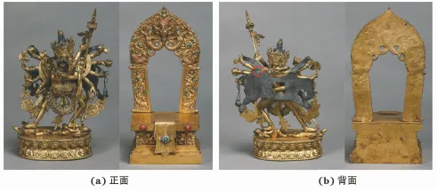 上乐金刚在清宫也译作胜乐金刚、上乐王佛,是藏传佛教无上瑜伽部母续重要的本尊之一。笔者对故宫博物院收藏的清代上乐金刚进行资料查阅,发现上乐金刚主要以唐卡和雕塑的形式存在,其中唐卡类上乐金刚所持象皮均为白色,具有一 定的写实性,对36尊金属质上乐金刚进行观察,发现有30尊上乐金刚所持象皮颜色与佛像本体颜色相同,5尊上乐金刚所持象皮颜色与背光颜色相同,其中象皮颜色与背光正面颜色相同的有5尊,象皮颜色与背光反面颜色相同的有1尊,而文物号为故198108的铜鎏金上乐金刚(见图1) 所持象皮颜色与佛像本体颜色及背光颜色均不相同。对此铜鎏金上乐金刚所持象皮进一步观察发现其质软,断口处呈银白色,初步推断象皮基体材料为银,而表面黑色物质为银质基体的腐蚀产物还是乌银装饰层却无法辨识。 图1 故198108铜鎏金上乐金刚 乌银指铜、银、铅中至少一种金属与硫在高温下生成的金属硫化物,乌银可以通过镶嵌或者涂覆的方法镶嵌或覆于金、银、铜质器物表面,此种金属表面装饰工艺被称为乌银镶嵌。通过观察清宫旧藏的涂覆乌银的器物表面,发现乌银装饰层与银质器物的腐蚀产物在感官上极为相像,而科学研究表明我院收藏的覆以银质器物表面的乌银除含有螺硫银矿外,还含有不同种类的铜硫化物,在有鎏金层的银质器物上还可能含有金银硫化物。 本工作通过科学的研究方法对象皮脱落的残件进行检测分析,并采用对比分析的方法对象皮颜色的成因进行科学的阐释,以期为故198108铜鎏金上乐金刚的保护修复提供科学参考。 1. 1试验样品来源 试样取自故198108铜鎏金上乐金刚象皮断裂处脱落的残件。 1.2 试验方法 采用便携式显微镜、金相显微镜、环境扫描电镜及能谱仪(ESEM-EDS) 、微区X射线衍射分析仪对象皮残件表面和断面进行微观形貌观察、成分及物相分析,以明确象皮颜色成因。 1. 2. 1 形貌观察及成分分析 使用3R-MSA600型便携式显微镜对未包埋的象皮残件进行表面微观形貌观察,采用Olympus金相显微镜和FEI公司QUANTA-650型环境扫描电镜对光敏树脂包埋抛光后的象皮残件进行断面观察,利用APOLLO-X型能谱仪对象皮残件基体及表面黑色物质进行成分分析。环境扫描电镜及能谱仪(ESEM-EDAS) 测试条件:工作电压25kV,背散射电子相,能谱面扫描时间50s。 1. 2. 2 物相分析 使用德国BrukerD8Discoveryμ-XRD设备对象皮残件表面黑色物质层进行物相分析,测试条件:铜靶,测试电压50kV,电流1.0mA。 2. 1 形貌观察及成分分析 由图2可见:象皮表面覆有一层黑色的物质,部分区域因尘土覆盖,颜色分布不均。 图2 象皮残件表面微观形貌(200×) 由图3可见:象皮主要分为两层:中心的金属基体层和环绕于基体的物质层,金属基体最大厚度约为143μm,表面黑色物质层厚度约为19μm,十分均匀、平整地分布于基体表面,这一现象亦可以从背散射图片中清晰看出。背散射图片中未见两种物质层之间清晰的分界面,这是由于背散射图像的亮度与原子序数相关,亮度不同说明含有元素种类及含量不同,而象皮残件背散射图上下两层的亮度几乎相同,表明金属基体与表面黑色物质层在元素组成上较为相似,但仍存在一定的差异。 图3 象皮残件金相及背散射图片 对象皮残件基体(背散射 a区域) 、黑色物质层 (背散射b区域)进行能谱分析,结果发型:象皮基体(a区域) 为银铜合金,其中铜的质量 分数高达 6. 09% , 因此铜是人为添加用以增加象皮 硬度,防止象皮发生变形的。元素分析结果表明,基 体表面黑色物质层(b区域) 仍以银铜为主要元素, 这一结果也解释了背散射图片中基体与表面黑色物 质层未出现清晰分界面的原因, 同时元素分析结果 表明黑色物质层中含 S、Cl、O三种元素。 2.2 物相分析 图4所示为象皮表面黑色物质层X射线衍射结果,结合元素分析结果可以确定较强的三个峰为银的特征峰,此外在2θ角为3395°、36. 88°、40.15°、40.42°、42.85°、43.35°、44.12°等处也出现了特征峰,对比标准谱线确定其为螺硫银矿(Ag2S)的特征峰,因此可以确定象皮表面的黑色物质主要为螺硫银矿。然而物相分析未检测出与O、Cl元素相关的化合物,这可能是由于检测位置黑色物质层中相关元素的化合物含量较低。 图4 象皮表面黑色物质XRD结果 2.3 讨 论 检测分析结果表明象皮为银铜合金,表面黑色物质层中除基体元素外还出现了 O、S、Cl元素,物相分析结果表明黑色物质主要为螺硫银矿。此前的工作实践及研究结果表明,在故宫博物院收藏的以银为主要基体材质的文物中,表面类黑色物质层主要有两种形成途径:银质器物在大气环境中发生腐蚀,表面形成类黑色的腐蚀产物层;银质器物表面覆以乌银后形成具有一定装饰功能的类黑色物质层。此两种途径形成的类黑色物质层在感官上极为相像,但在物相组成上存在差异,因此通过物相组成仍能辨识出银质器物表面黑色物质的来源。然而象皮表面黑色的Ag2S既可能是银质基体的腐蚀产物,亦可能是银/硫乌银,无法通过物相分析结果来辨识其来源,故仍需对象皮表面Ag2S的来源进行进一步分析。 银具有高稳定性,这种化学稳定性有益于其耐腐蚀性,然而银质器物在大气环境中仍会发生腐蚀而在表面形成一种暗黑色的膜,这种现象称为银的晦暗。银发生腐蚀是因为金属相的耐蚀性主要取决 于三个因素: (1) 金属的电位。电位除与自身的标准电位有关,还与金属内部存在的