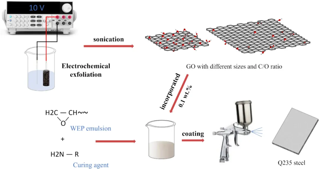 水性涂料在应用中也存在一些缺点。由于水的表面张力大,涂层在固化过程中容易产生孔隙,成为腐蚀介质渗透的通道。此外,由于涂层与基材之间的粘附强度较低,涂层在使用过程中会脱落。因此,通常加入低维材料来弥补这一缺点,由于低维材料尺寸小,官能团丰富,可以填充孔隙,增强树脂与金属基材之间的附着力。氧化石墨烯(GO)因其理想的二维紧密结构、高比表面积、化学稳定性以及对腐蚀性介质的优异阻隔性能而备受关注。大量研究表明,使用GO的复合涂层能有效提高其耐腐蚀性。但过量的GO(如在WEP中添加0.4wt%)会发生堆积和聚集现象,从而降低了涂层的防腐性能。许多研究都集中在GO的功能改性上,以提高其在水性涂料中的分散性能。然而,很少有研究关注GO填料的结构和形态。GO粒径对复合环氧涂层防腐性能的影响规律和机理值得进一步深入研究。