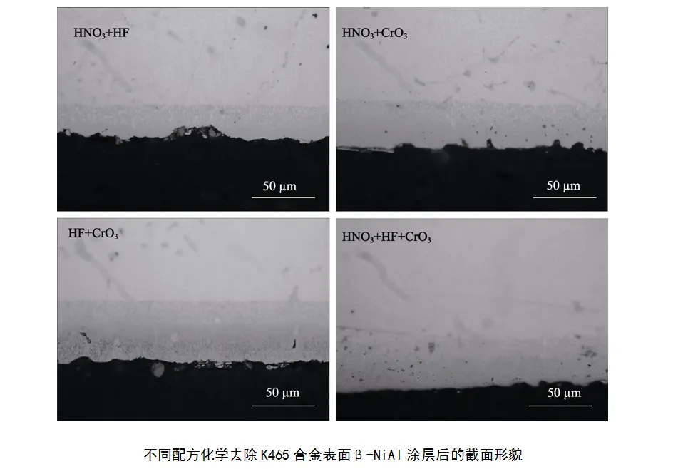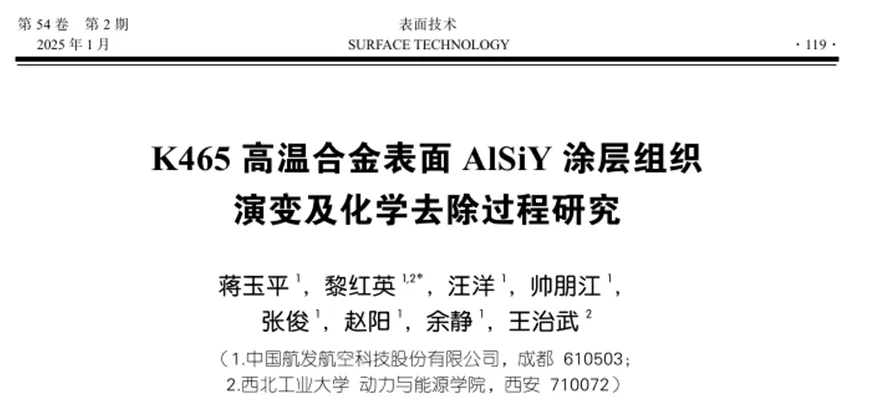 第一作者:蒋玉平 通信作者:黎红英正高级工程师 第一作者单位:中国航发航空科技股份有限公司 DOI:10.16490/j.cnki.issn.1001-3660.2025.02.009 基金项目:国家自然科学基金(12372338);陕西省自然科学基金(2022JZ-20) 背景与意义: 然而,电化学去除方法并不适用于形状复杂的零件,尤其是航空发动机叶片,因此,采用化学试剂方法去除叶片铝化物涂层仍然是主流的技术途径。尽管目前有一些成熟的化学去除剂配方,但对于不同成分的铝化物涂层依旧无法做到效果一致。究其原因是人们对化学去除剂中各组分的作用依旧认识不清,导致无法根据涂层成分特点设计高效化学去除剂。为了保证涂层均匀去除,首先考虑化学去除剂能够均匀去除外层。本文研究的目的是阐明化学去除剂常用组分对AlSiY涂层外层化学去除效果的影响,揭示铝化物涂层不均匀化学去除的原因,进而为设计高效化学去除试剂奠定理论基础。 【关键词】K465高温合金;AlSiY涂层;化学去除;组织演变 蒋玉平, 黎红英, 汪洋, 等. K465 高温合金表面 AlSiY 涂层组织演变及化学去除过程研究[J]. 表面技术, 2025, 54(2): 119-126. JIANG Yuping, LI Hongying, WANG Yang, et al. Microstructure Evolution and Chemical Removal Process of AlSiY Coating on K465 Superalloy Surface[J]. Surface Technology, 2025, 54(2): 119-126.