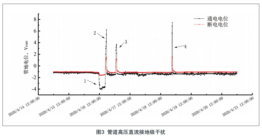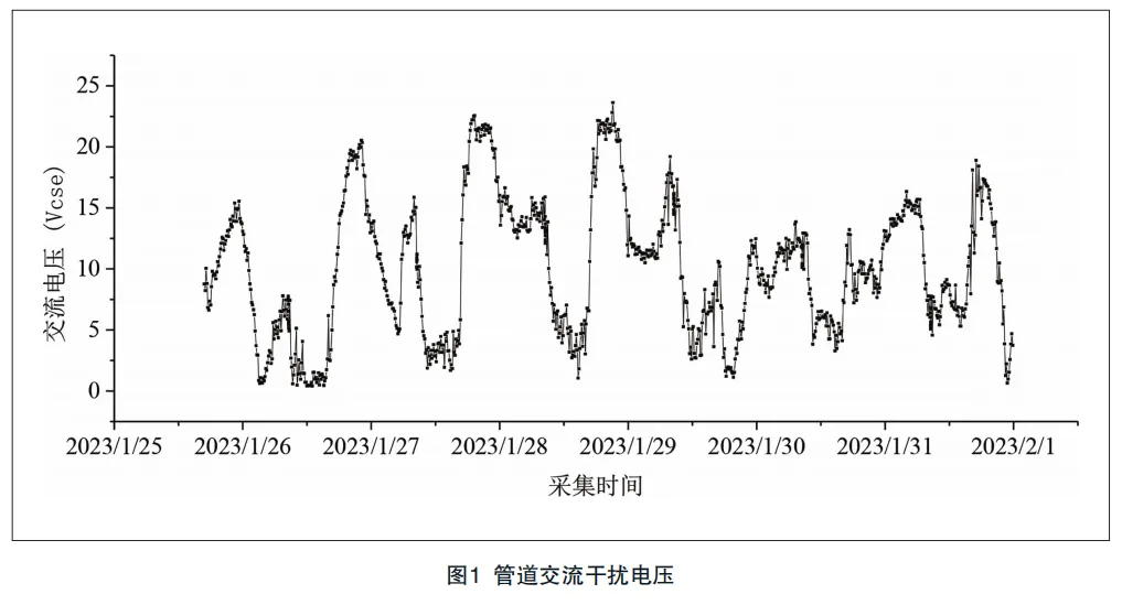 目前阴极保护智能监测系统在提升管道阴极保护管理方面展示出了多方面的优点,图1为某管道与220 kV交流输电线路交叉后长距离并行,采用远程监测技术可以实时监测交流干扰电压参数,根据交流电压评价在输电线路稳态运行时埋地管道的交流干扰和交流腐蚀情况。