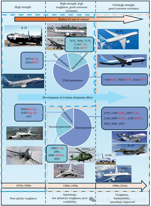论文首先回顾了航空铝合金的发展历程。自20世纪初“时效硬化”技术被发现以来,航空铝合金经历了从Al-Cu系列到Al-Zn-Mg-(Cu)系列,再到Al-Li系列的演变。通过不断优化合金成分和热处理工艺,铝合金的强度、韧性和耐腐蚀性得到了显著提升。例如,2024铝合金因其高强度被广泛应用于机身、机翼等关键结构部件;而7075铝合金则以其优异的强度和耐腐蚀性成为航空航天领域的常用材料。