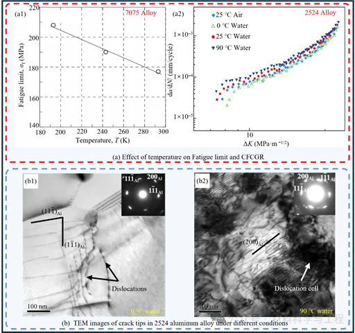 论文详细分析了影响航空铝合金腐蚀疲劳行为的多种因素,包括外部环境因素(如温度、介质类型)和内部微观结构因素(如晶粒尺寸、织构、析出相和残余应力)。例如,在不同温度下,铝合金的腐蚀疲劳性能表现出显著差异。低温环境下,腐蚀介质活性降低,合金的疲劳性能得到改善;而高温则加速了腐蚀过程,导致裂纹扩展速率增加。此外,合金的微观结构对其腐蚀疲劳性能也有重要影响。细晶粒尺寸和优化的织构可以提高合金的耐腐蚀性和疲劳强度,而析出相的分布和尺寸则直接影响裂纹的萌生和扩展路径。