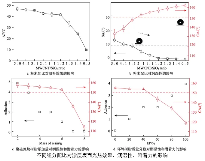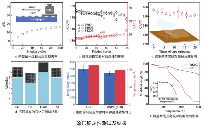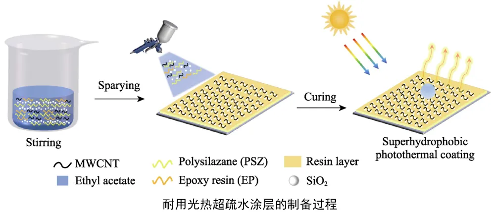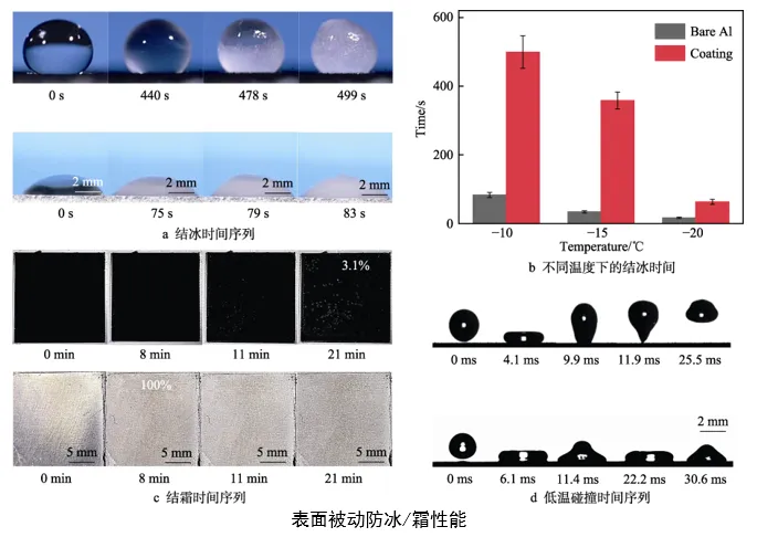 第一作者/通信作者:刘亚华教授 通信作者:卢晨光 作者单位:大连理工大学 DOI:10.16490/j.cnki.issn.1001-3660.2025.02.016 基金项目:国家重点研发计划(2022YFB4602401);国家自然科学基金(52075071) 结冰、结霜等作为低温环境下的自然现象,常常会对户外工业、电力、交通等基础设施造成安全隐患,并由此产生了巨大的直接或间接财产损失。传统主动除冰方法不仅效率低、能耗高,而且会污染环境。近年来,利用材料自身特性实现被动除冰的方法得到广泛研究。超疏水表面因其具有低表面能的微纳结构而表现出极端斥水性,故在防冰领域表现出广泛的应用前景。但是大多数超疏水材料在高湿低温条件下因冷凝液滴填充微/纳米结构导致防冰性能失效,且冰与表面微纳结构的互锁,使除冰时表面结构被破坏,会进一步降低其使用寿命,因此,在不破坏表面功能的情况下实现节能和环保的除冰/除霜是必要的。 最近,太阳能光热材料得到研究人员的广泛关注。光热材料在光照下能够获得显著的温升,因此设计具有光热和超疏水功能协同作用的防冰表面有望增强其防/除冰效果。本研究使用聚硅氮烷、环氧树脂、疏水SiO2纳米颗粒和多壁碳纳米管设计涂料配方并制备光热防/除冰涂层,具有工艺简单、材料环保的优点,可实现大规模制备。疏水SiO2颗粒与多壁碳纳米管在喷涂中形成的复合微纳结构分别赋予了涂层优异的超疏水性与光热转换能力,大幅增强了涂层的防/除冰性能。环氧树脂为涂层提供了良好的成膜性与基底附着力,聚硅氮烷树脂进一步强化附着力的同时增强了涂层的硬度,强化了涂层的耐磨损性能。该耐用涂层在经历了摩擦磨损试验后仍具有出色的延迟结冰与光热转换能力。 刘亚华, 宋文卓, 李文宗, 等. 耐用光热超疏水涂层的防/除冰性能及其稳定性研究[J]. 表面技术, 2025, 54(2): 191-201. LIU Yahua, SONG Wenzhuo, LI Wenzong, et al. Anti/de-icing Performance and Stability of Durable Photothermal Superhydrophobic Coatings[J]. Surface Technology, 2025, 54(2): 191-201.