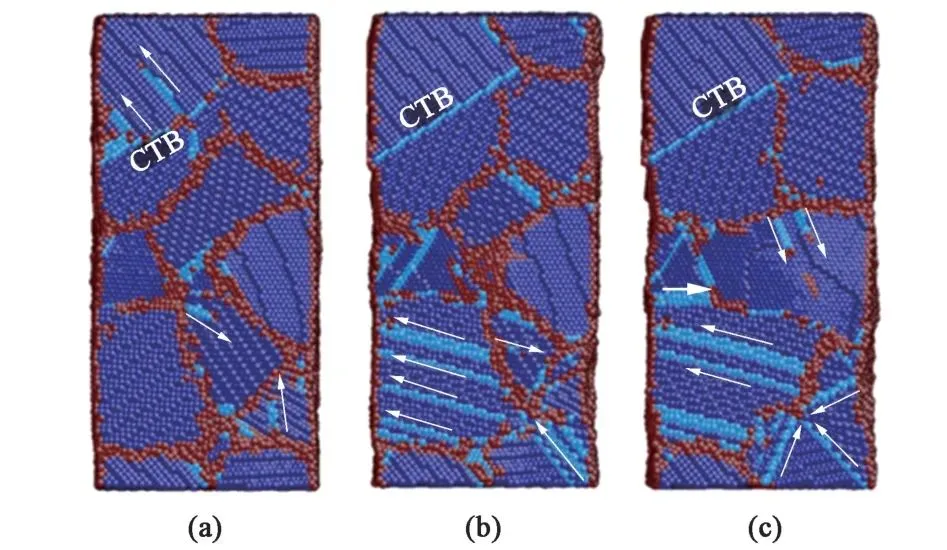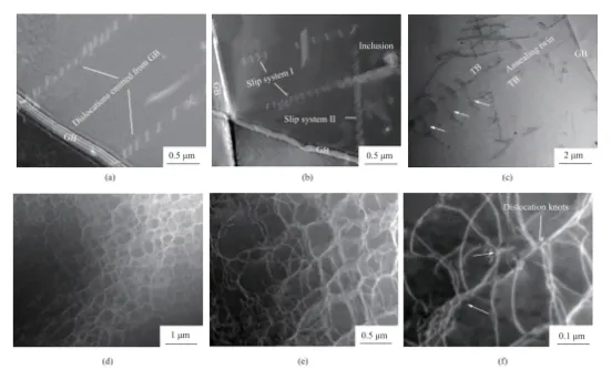 (a)104次后晶界处产生的位错 (b) 104次后位错滑动 (c) 104次后位错堆积(d) 106次后晶粒内部的位错胞 (e) 106次后位错胞放大视图 (f) 106次后位错缠结