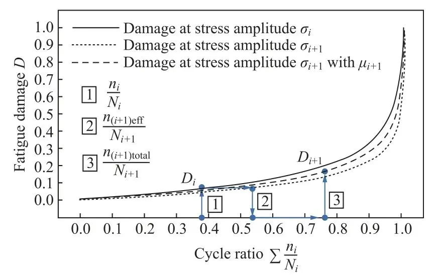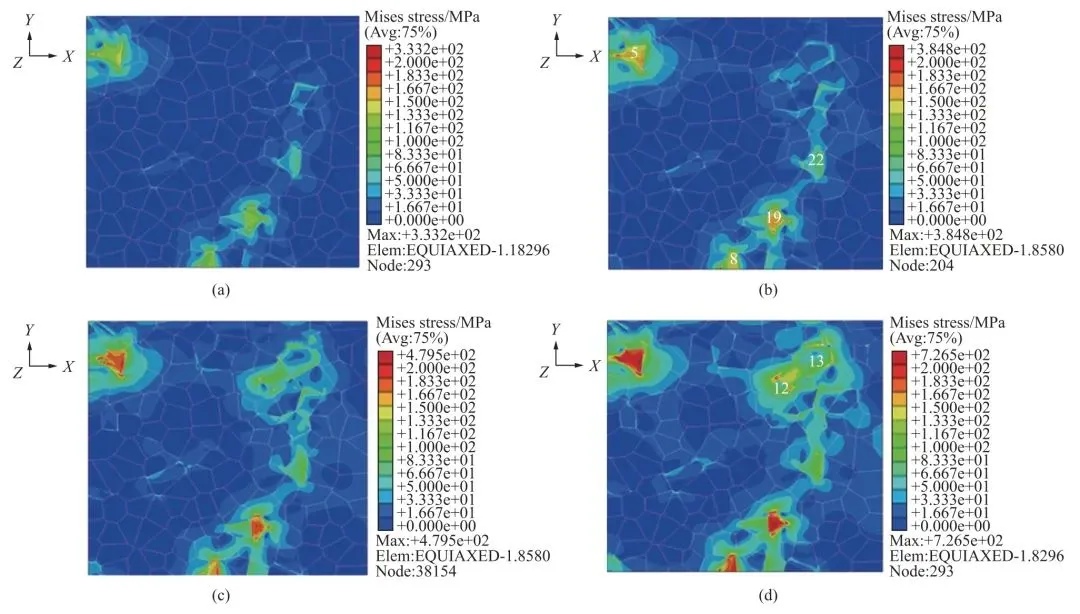 王德龙1, 王明明1, 李瑞升1, 张晓妍2, 李冬冬1, 纪宏超1, 张好强1 (1.华北理工大学 机械工程学院;2.华北理工大学 冶金与能源学院) 摘 要:金属材料高周疲劳失效是机械工程领域中一种极为重要的失效形式, 也是引起恶劣安全事件的重要原因。为了深入研究金属材料的高周疲劳过程、疲劳寿命的影响因素及疲劳过程中的组织演变规律等, 疲劳实验、 断口分析和组织表征等手段已被引入疲劳失效分析, 此外, 为了缩减实验周期, 并且能够对疲劳过程进行表征, 还产生了多种高周疲劳预测、仿真模型。因此,本文在汇总金属材料高周疲劳失效特征、失效机理的基础上, 着重对高周疲劳的预测方法、仿真方法和数学模型进行了阐述, 旨在为深入理解和预测金属材料的高周疲劳性能提供参考。 关键词:高周疲劳;疲劳性能预测;疲劳模拟 引言 高周疲劳(High Cycle Fatigue, HCF) 是工程领域中的一个重要问题, 特别是在航空、 汽车和机械制造等行业中受循环载荷的零部件, 因循环载荷造成的累积损伤更易使其发生疲劳破坏。随着工程结构轻量化要求和服役环境的严苛性, 金属材料在高周循环载荷下的性能和寿命变得更为关键。并且随着高周疲劳循环次数的增加, 金属材料显示出了不同于低周疲劳的损伤、 失效行为, 这给材料设计和结构寿命评估带来了挑战。为了解决金属材料高周疲劳失效机理问题, 科研人员持续探索了不同的测试、 表征方法和技术, 其中包括材料表征、 数字仿真模拟和实验验证等。 本文总结了金属高周疲劳性能及模拟的研究进展, 分析了当前高周疲劳研究存在的问题, 讨论了材料表征方法、 仿真模型和实验技术的发展, 并探讨其应用在工程实践方面的潜力。此外还提出了未来金属高周疲劳研究的方向和挑战, 以促进该领域的进一步发展和创新。为金属材料高周疲劳性能及模拟研究提供参考, 以及相关工程实践提供科学依据和技术支撑。 1.高周疲劳失效特征 高周疲劳是机械工程领域中一种常见的疲劳失效形式, 具有以下几个特征。 (1) 高周疲劳是在高周次循环载荷下发生的。材料在每个循环载荷的作用下都会经历应力、 应变的变化。循环次数的增加会导致位错增值, 产生应力集中现象, 出现循环强化或软化, 最终导致材料逐渐接近疲劳极限。与其他疲劳形式相比, 高周疲劳寿命通常在105~107循环次数。在疲劳失效过程中, 不同的疲劳类型存在着不同的破坏机理, 如图1所示。对于高强钢而言, 如果材料在低周阶段就己经发生疲劳失效, 则其疲劳失效源通常位于材料表面, 如加工引起的刀痕等; 若材料在高周阶段发生疲劳失效, 则疲劳失效源通常位于材料内部, 如内部夹杂物等。 图1 不同疲劳类型的S-N曲线(a) 轴向加载疲劳 (b) 旋转弯曲疲劳 (2) 高周疲劳属于弹性疲劳。在高周疲劳中,材料在每个循环中都会回弹到原始状态, 没有塑性变形。这表明在高周疲劳破坏发生前, 材料通常不会出现明显的变形。最后, 高周疲劳的破坏通常是突然发生的。在经历大量循环后, 材料的疲劳寿命达到极限, 出现裂纹并最终导致失效。与静态加载下的破坏不同, 高周疲劳失效往往没有明显预兆, 很难通过外观检查等方法提前发现。因此了解高周疲劳的特征对于机械生产来说至关重要, 可以帮助设计和评估材料和结构的疲劳寿命, 以保证产品的可靠性和安全性。 2.高周疲劳失效机理 在高频载荷往复加载下, 材料内部发生微小、反复的弹性变形, 进而形成应力集中区域。这些应力集中区域可以导致材料局部塑性变形, 产生微小裂纹。这些裂纹在应力周期的作用下, 扩展并逐渐增长, 直至达到临界尺寸, 导致材料的断裂。下文将对在高周疲劳失效模式中起重要作用的相关因素进行讨论。 2.1 应力集中 高周疲劳失效通常在应力集中的位置发生。细小裂纹或夹杂物周围的应力集中会导致材料局部应力增加, 从而加速裂纹的形成和扩展。通过研究孪生诱发塑性 (Twinning Induced Plasticity,TWIP) 钢的高周疲劳行为, LIU R等发现位错可以在夹杂界面处形成位错堆积, 导致高应力集中,因此夹杂物界面是微裂纹形核的潜在位置; 而孪晶界处的应力集中较低, 因此孪晶界不能作为微裂纹萌生的场所。BELYAEV M S 等研究了由低碳单晶难熔镍合金制成的缺口试样的高周疲劳, 缺口位置处应力集中导致HCF 限值显著降低, 这表明应力集中是材料提前疲劳失效的一大因素。 TANG B 等开发的条件概率等效熵模型(Conditional Probability Equivalent Entropy Model,CPFE) 成功捕捉到了高周疲劳加载条件下应力集中现象。图2为不同应力水平下HCF 加载100次后微观结构中的Mises 应力分布。 图2 不同应力水平下100 次循环加载后的应力分布(a) 300 MPa (b) 350 MPa (c) 400 MPa (d) 450 MPa 从图2a和图2b可以看出, 当应力水平为300和350MPa 时, 应力集中主要存在于晶粒5#、8#、19#和22#, 而当应力水平增加到400和450MPa时, 晶粒12#和13#周围的应力集中明显增加, 这些晶粒的共同特点是其施密特因子较大, 微塑性累计较多。此外, 可以观察到最大应力位置随应力水平的变化而变化。因此应力集中是高应力水平HCF加载条件下一个重要的疲劳指标参数。 2.2 微观缺陷 微观缺陷如夹杂物、晶界和位错等, 对高周疲劳失效起着重要作用。在夹杂物含量基本相同的条件下, 夹杂物的大小、 形状及分布特征对疲劳寿命都具有明显的影响, 夹杂