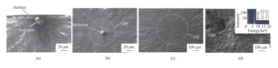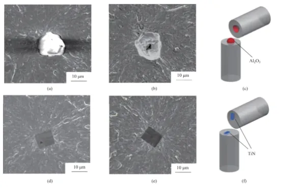 (a)Al2O3夹杂物图 (b)Al2O3夹杂物剥离图 (c) 含Al2O3夹杂物的疲劳断裂示意图(d) TiN夹杂物图(e) TiN 夹杂物剥离图(f) 含TiN夹杂物的疲劳断裂示意图