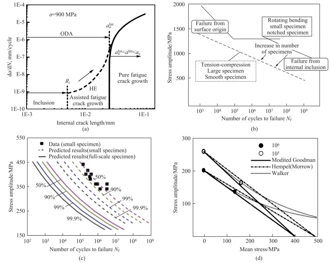 (a) 疲劳裂纹扩展速率与裂纹长度关系 (b) 随载荷类型及试样尺寸变化的S-N 曲线(c) 小试样数据预测的铁路轴P-S-N曲线 (d) 球墨铸铁的P-S-N曲线