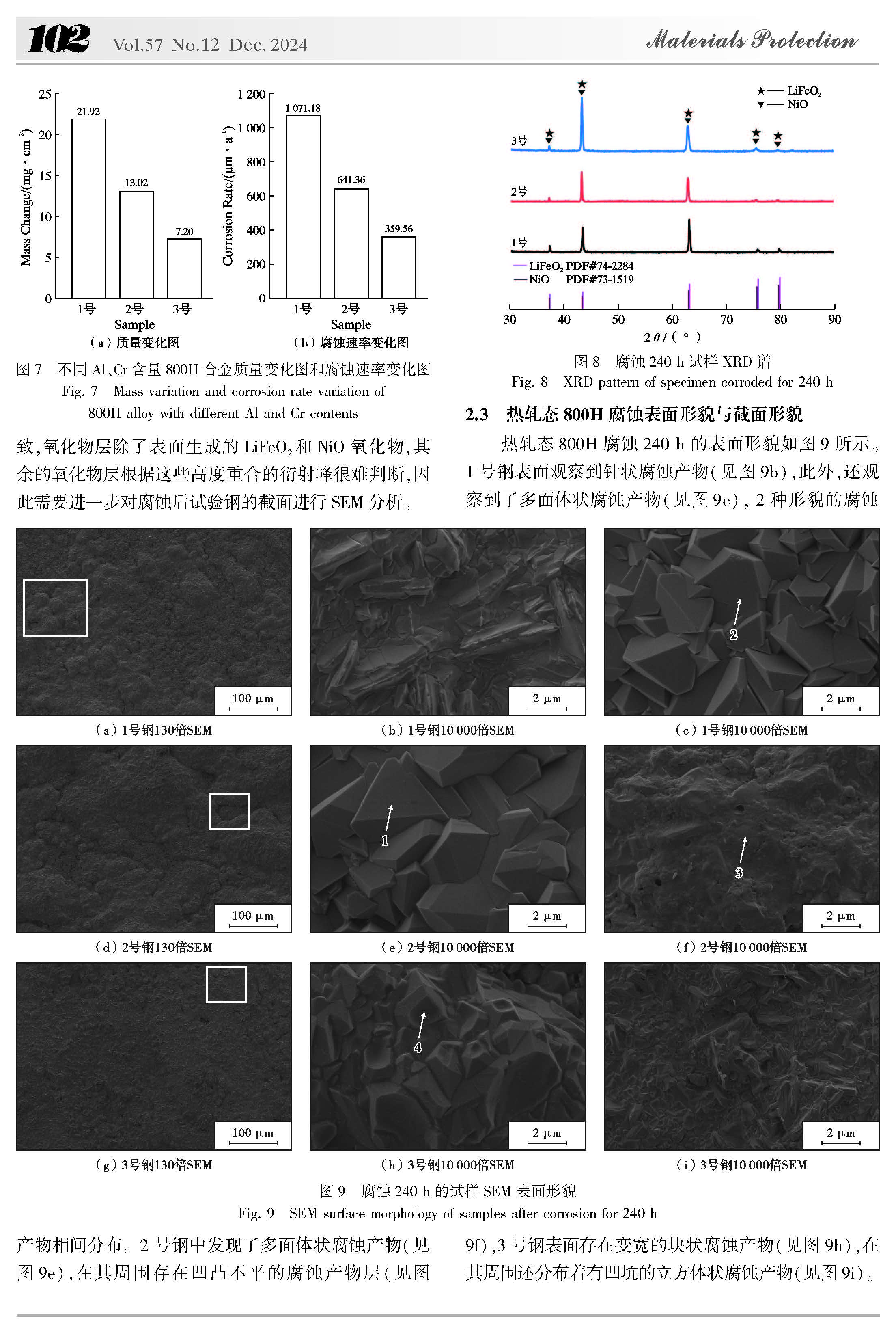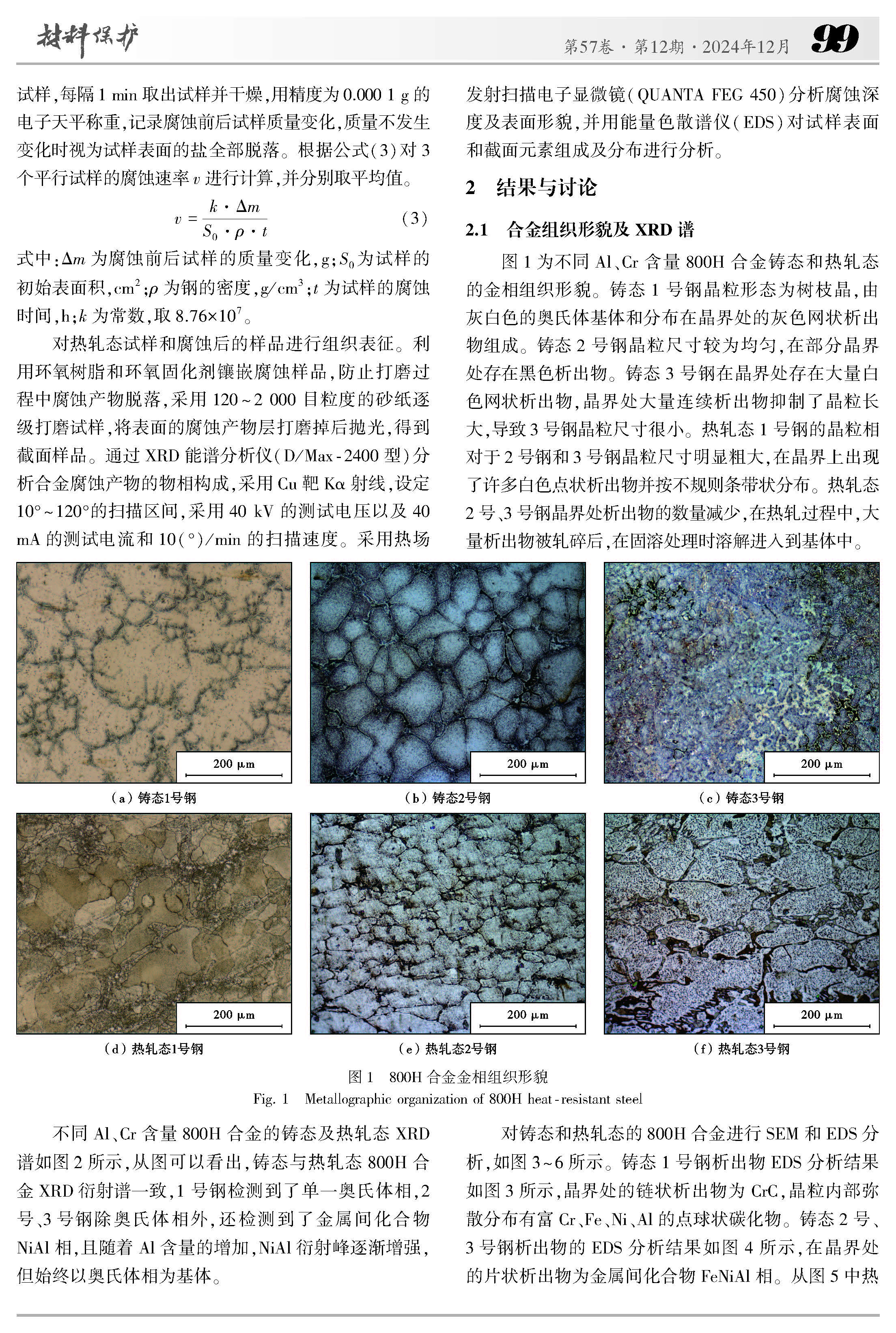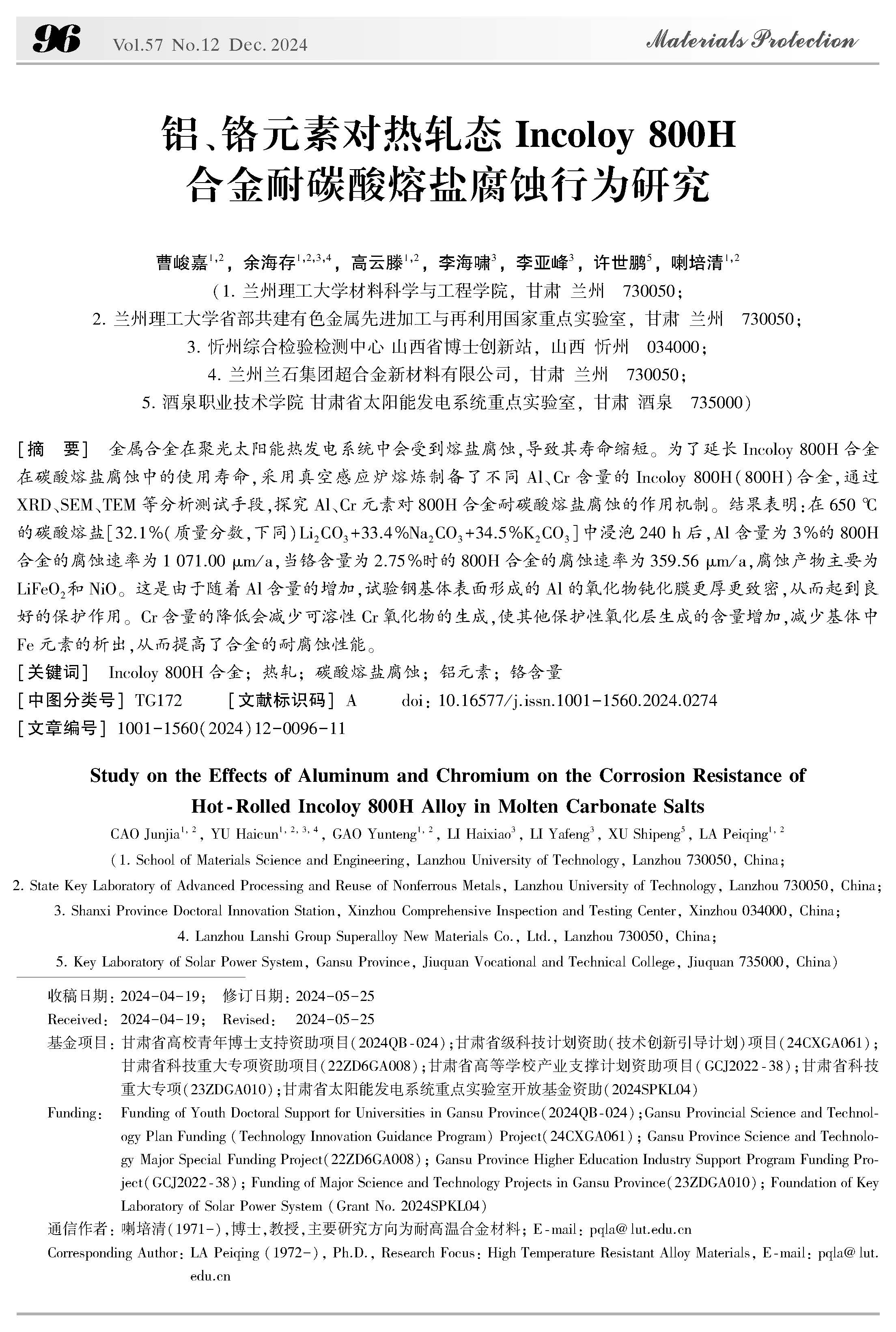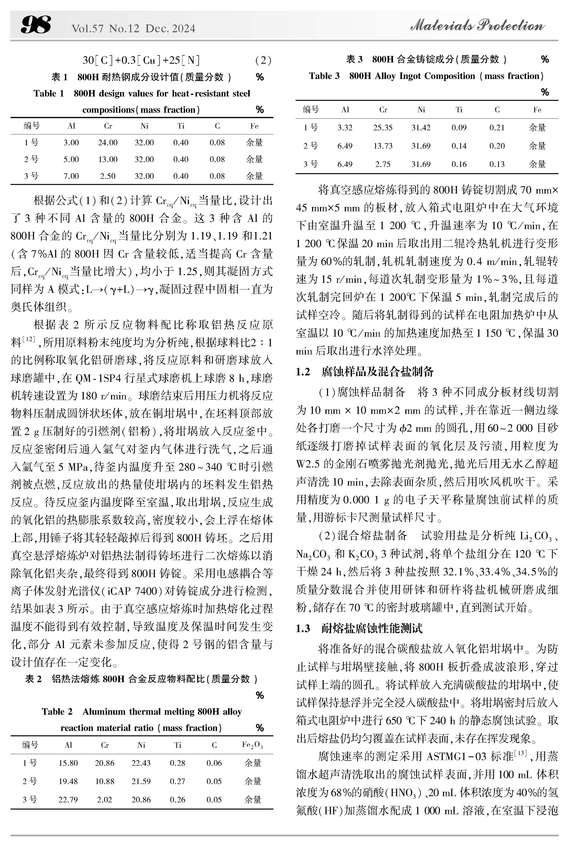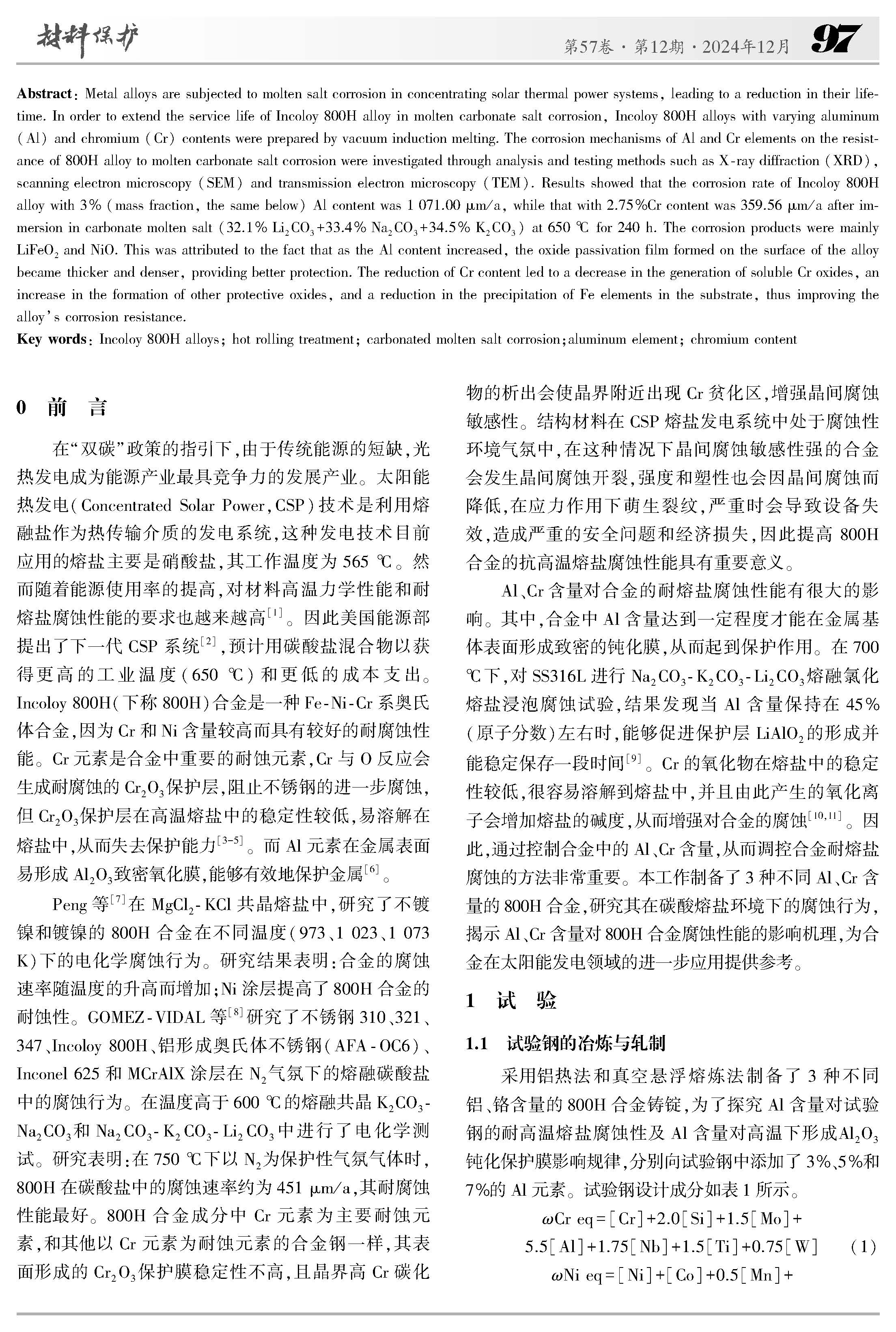 铝、铬元素对热轧态Incoloy 800H合金耐碳酸熔盐腐蚀行为研究