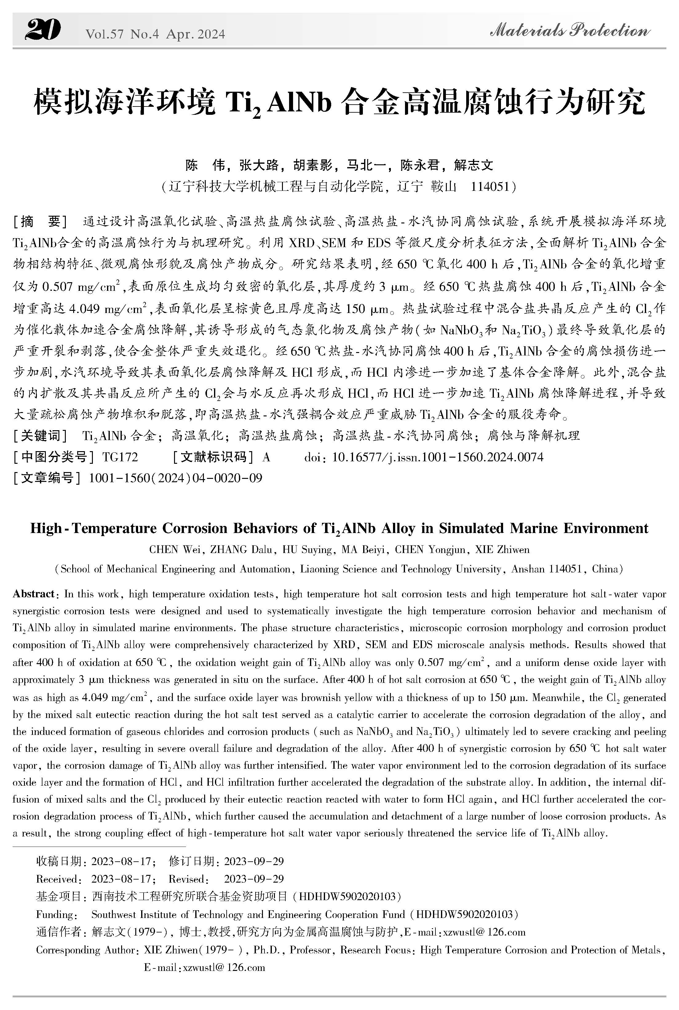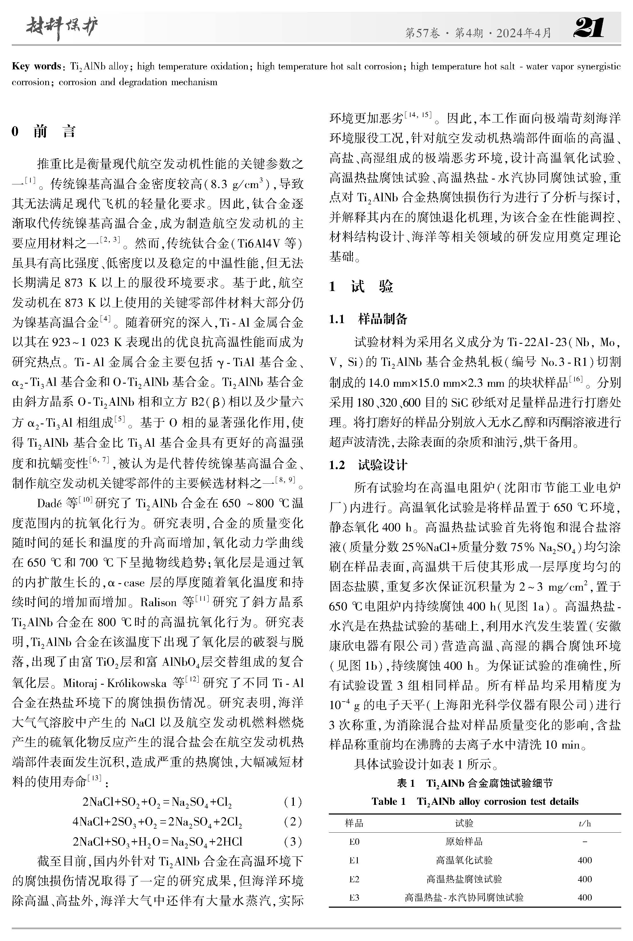 模拟海洋环境Ti2AlNb合金高温腐蚀行为研究