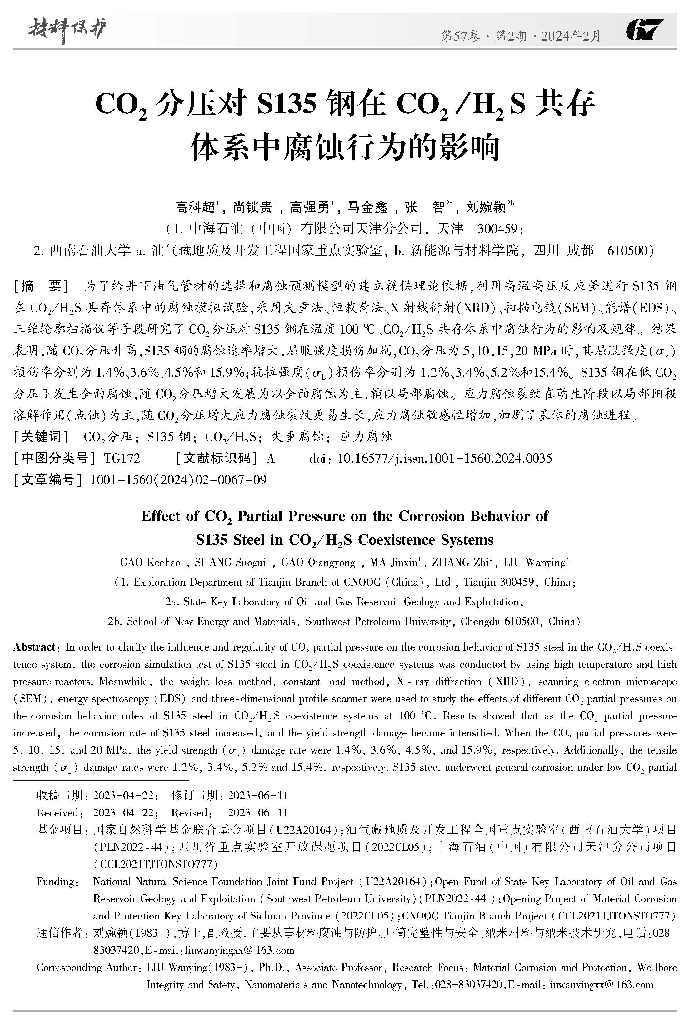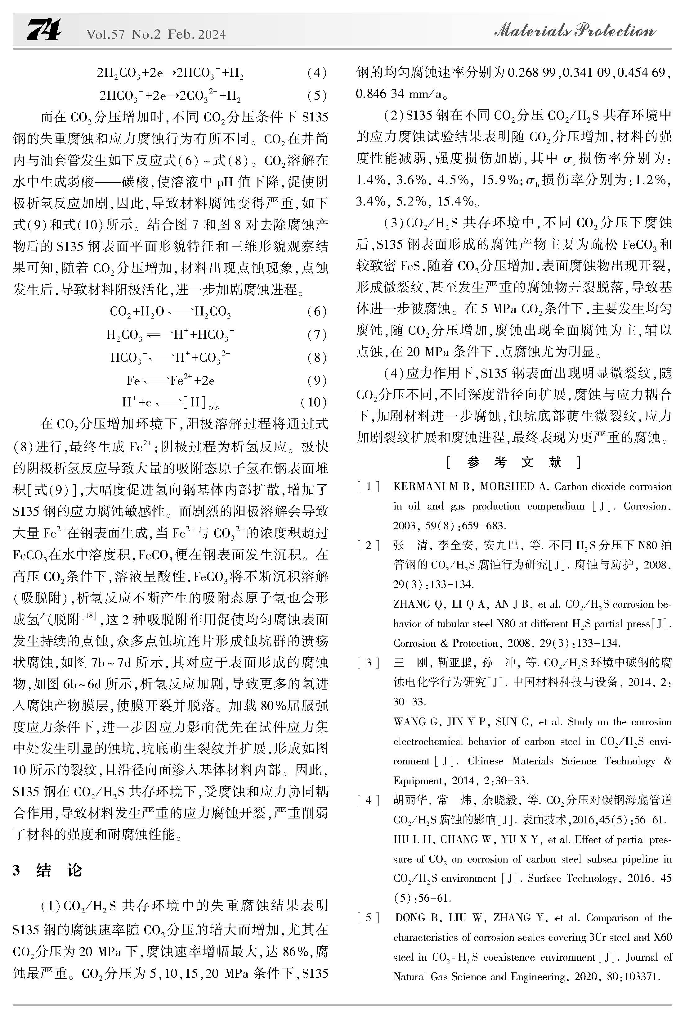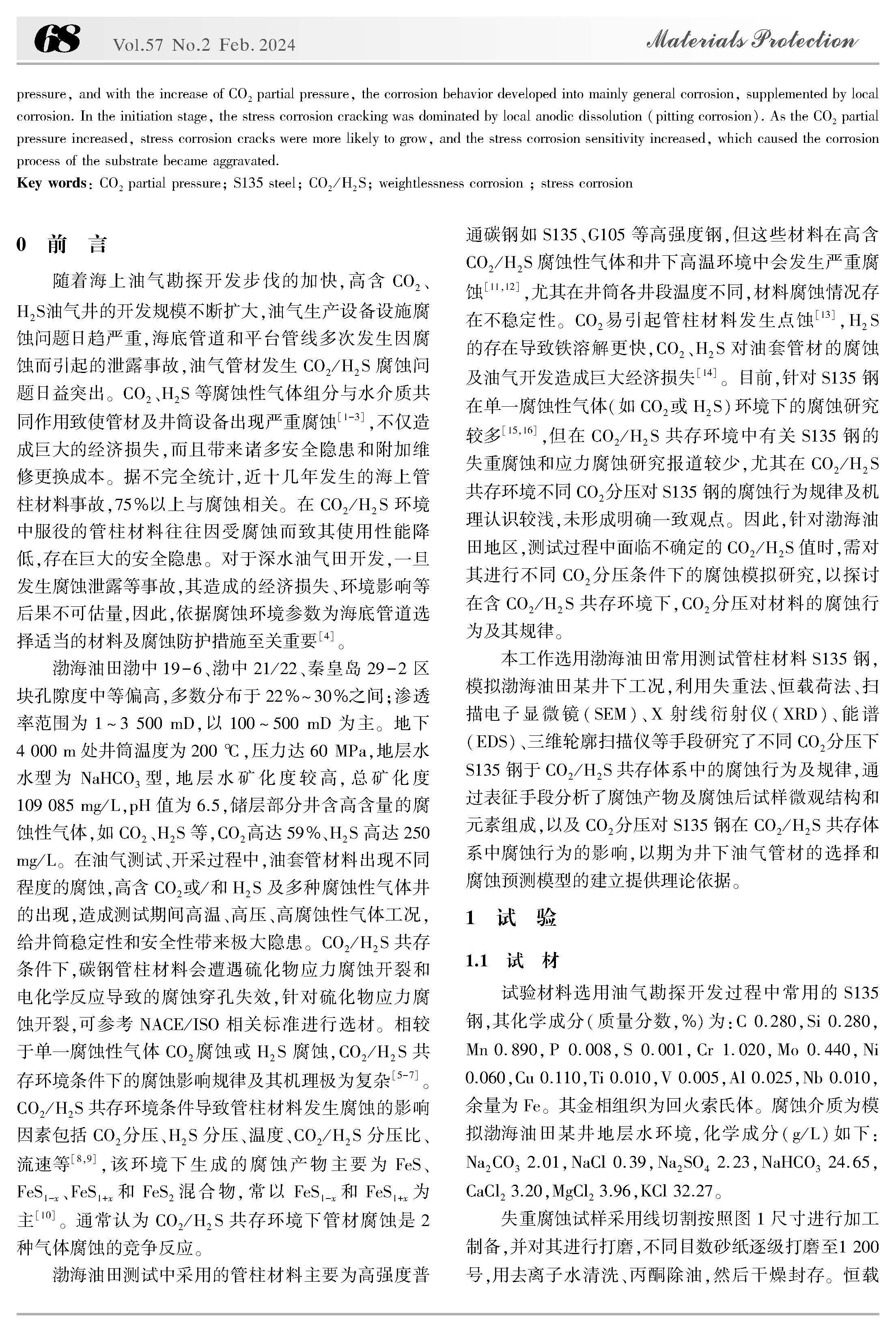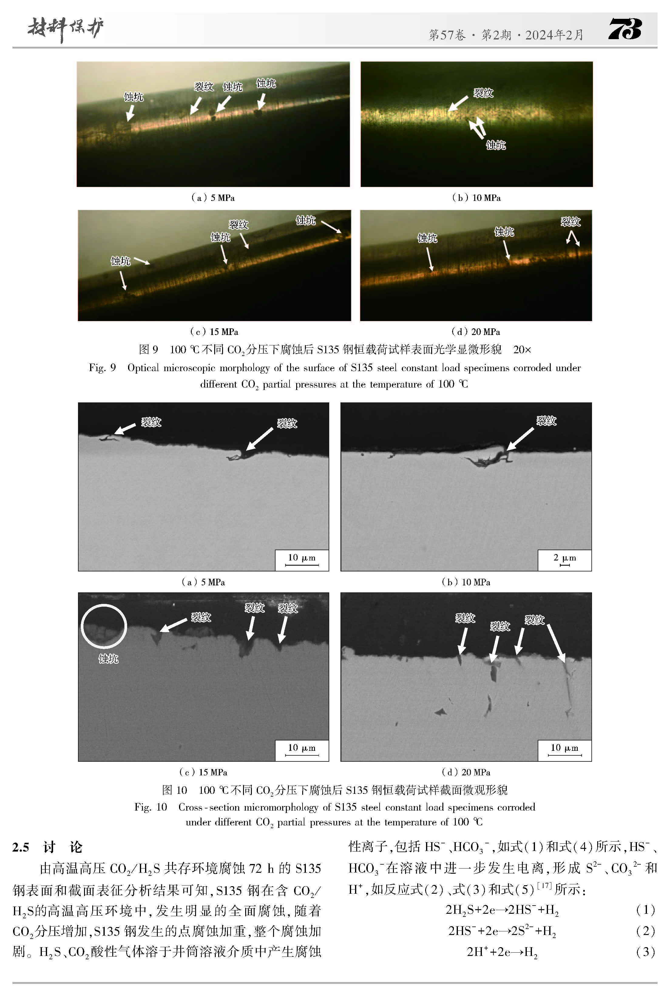 CO2分压对S135钢在CO2/H2S共存体系中腐蚀行为的影响