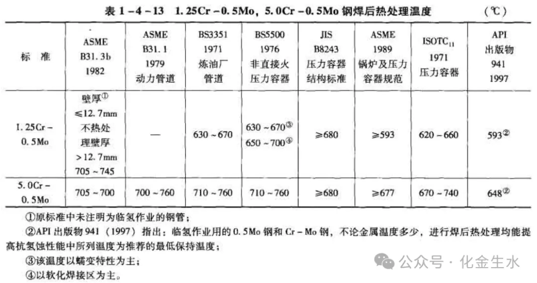 图中实曲线的上边是内部脱碳产生裂纹而破坏的范围。实曲线的下边和左边是碳钢和各种合金钢耐氢腐蚀的使用范围。 在曲线上标注的材料是选择所需最小合金含量,并非为标准合金。在埃索标准上并规定当温度和氢分压落在图1-4-3(a)所示任一曲线上时,则应选用更高一条曲线所示的所需最小合金含量。 据资料介绍,在稍高于0.7MPa的压力下,经过长期和氢接触的碳素钢管焊接部位有蚀的情况。一根煨弯的弯管,氢蚀集中在受过热的弯头部位,而未加热的直管段未受氢蚀。奥氏体不锈钢在所有温度、压力下都耐氢蚀。图1-4-3(a)的横座标分压仅以气相为基准,氢分压等于气相中氢分子分数乘系统总压力。 图中曲线的绘制是对铸钢、退火钢和正火钢进行应力评价而得出的。 纳尔逊曲线是1967年由纳尔逊绘制的,再版权授与了API。纳尔逊曲线在1969年1977年、1983年和1996年曾进行了修改,本图是2004年API出版物941中的纳尔逊曲线,即临氢作业用钢防止脱碳和裂纹的操作极限,它是截至目前最新的版本,将高温临氢作业用Cr-0.5Mo和1.25Cr-0.5Mo钢使用经验另绘图,如图1-4-3(b)所示。 一般抗氢蚀钢管,不仅要满足常温时对强度、延性及韧性的要求还要满足高温机械性能的要求;不仅要满足在交货状态时对机械性能的要求,还要考虑在使用时的性能退化(如回火脆性、石墨化)等因素。例如对催化重整装置中设计温度540℃、氢分压1.25MPa的工艺管道,从NELSON曲线中,可选用1.25Cr-0.5Mo合金管,不必选用5.0Cr-0.5Mo合金钢管。 表1-4-11是1.25Cr-0.5Mo及5.0Cr-0.5Mo钢管的力学性能数据。 1.25Cr-0.5Mo及5.0Cr-0.5Mo合金钢均属耐热钢,1.25Cr-0.5Mo是一种较经济的钢种,其价格约为5.0Cr -0.5Mo的1/2,有较高的蠕变强度,抗氧化温度593℃,在≤550℃时1.25Cr-0.5Mo钢最大许用应力均比5.0Cr-0.5Mo高。在≤550℃时1.25Cr-0.5Mo钢的高温短时拉伸强度不低于5.0Cr-0.5Mo钢,而塑性和延伸率基本相当。5.0Cr-0.5Mo钢抗腐蚀性能好,具有较高的蠕变断裂强度,抗氧化温度为648℃。 但是,在650℃范围内,1.25Cr-0.5Mo钢比5.0Cr-0.5Mo钢有较高的蠕变断裂强度。从NELSON曲线查得,当氢分压1.37MPa(200psi)和2.07MPa(300psi)条件下1.25Cr-0.5Mo钢的脱碳温度分别为600℃和590℃,完全满足目前催化重整反应部分操作条件(温度510~540℃、氢分压1.25MPa)。 1979年,日本压力容器研究委员会氢脆分会对日本催化装置高温氢蚀情况进行了总结,认为那些氢蚀发生的条件在NELSON曲线相应钢种操作极限以下的情况中:很大一部分氢蚀发生在焊缝处。未经热处理焊缝的残余应力和高硬度的激冷组织,对氢蚀的敏感均比母材高,因而易在焊缝处发生氢蚀现象。 氢分子尤其氢原子,有很高的扩散率,在300℃时,铁晶格中的扩散率近14-4cm2/s。在高温时,由于氢分子的分解,焊接质量不高的焊缝处的气孔,不连续处和夹杂物,就成为氢和甲烷聚集的场所,由于甲烷不能向钢内部扩散,所以在内部形成高压,即在焊缝不够致密的地方造成裂纹或鼓泡。因此,焊缝和热影响区是抗氢蚀的薄弱部位。大多数情况下,氢蚀不发生在母材上而是在焊缝和热影响区。在选择和使用抗氢蚀钢时,要特别重视施工时的焊接质量,采用合适的焊接工艺,必要的焊前预热和焊后热处理。 生产实践和试验表明,Cr-Mo钢对焊接热作用相当敏感。对Cr-Mo钢进行焊接时热影响区会出现马氏体组织而产生明显的脆化。例如Cr-Mo钢母材的布氏硬度约为200,经焊接的热作用后希氏硬度增加至450以上。表征热影响区塑性的弯曲角由180°下降到不足 30°,这种脆化现象随Cr-Mo钢中Cr 含量的增加而增加。 5.0Cr-0.5Mo钢的脆化现象就比1.25Cr -0.5Mo钢更为严重。如果使用环境的分压偏高,将加剧脆化作用。为稳定和提高高温强度,增强耐蚀性,提高焊接区的延性和韧性,松弛焊接残余应力,确保焊接区的高温耐氢蚀性能,必须进行焊后热处理。各国标准中有关1.25Cr-0.5Mo及5.0Cr-0.5Mo钢焊前预热、层间温度、焊后热处理的规定如表1-4-12和表1-4-13 所示。