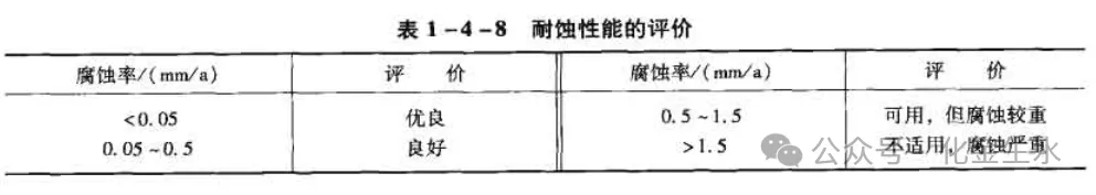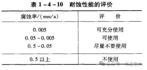 按《石油化工管道设计器材选用通则》(SH3059-2001)规定,介质对金属材料的腐蚀速率,管道金属材料的耐腐蚀能力可分为下列四类: 年腐蚀速率不超过0.05mm的材料为充分耐腐蚀材料; 年腐蚀速率在0.05~0.1mm的材料为耐腐蚀性材料; 年腐蚀速率0.1~0.5mm的材料为尚耐腐蚀性材料; 年腐蚀速率超过0.5mm的材料为不耐腐蚀材料。 一般应选择耐腐蚀性和尚耐腐蚀性的材料。当介质对某种金属材料的年腐蚀速率大于0.5mm 时,应经技术、经济比较,确定更换材料或增加腐蚀裕量;当介质对某种金属的年腐蚀速率不超过0.05mm时,应采用常规材料和低限腐蚀裕量。 《腐蚀数据手册》对均匀(全面)腐蚀的耐蚀性用均匀腐蚀率来评价,如表1-4-8所示。