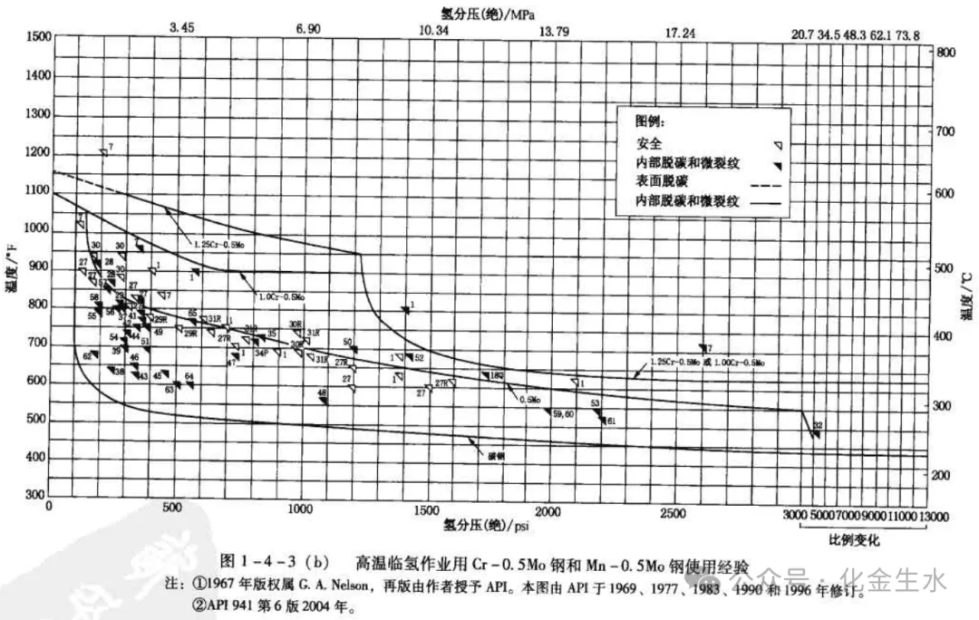 氢腐蚀 氢腐蚀有低温型和高温型。低温型是在有水溶液的情况下发生的,被认为是电化学腐蚀。金属电化学反应生成的原子氢渗透到金属内,然后结合为分子,形成鼓泡。这就是低温氢腐蚀。 在产生氢鼓泡的腐蚀环境中,通常含有硫化物、砷化合物、化物、含磷离子等毒素阻止了放氢反应(H+H→H2),石油化工生产流体中常含有这类毒素。因此在石油化工工业中氢鼓泡是一个重要问题。消除这类毒素是有效的防氢鼓泡的方法。 也可选用没有空穴的镇静钢代替有许多空穴的沸腾钢,采用对氢渗透低的奥氏体不锈钢或镍的衬里层,或橡胶、塑料保护层、瓷砖衬里和加人缓蚀剂等。 高温型氢腐蚀是高温氢侵入低碳钢内,在无水溶液的情况下进行,与低温氢腐蚀有本质上的不同。高温氢分子扩散到钢的内部会产生氢脆和氢蚀。所谓氢脆,是在高温、高压下分子氢部分分解变成原子氢,或者是氢气在湿的腐蚀性气体中经过电化学反应而生成氢原子这些氢原子渗透到钢里之后,使钢材晶粒间的原子结合力降低,造成钢材的延伸率、断面收缩率降低,强度也出现变化,这种现象叫氢脆。 所谓氢蚀是钢材长期与高温、高压氢气接触之后,氢原子或分子通过晶格和晶间而向钢内扩散,这些氢与钢中的碳化物(渗碳体)发生化学反应生成甲烷(Fe,C+2H,--3Fe+CH。),即钢材的内部脱碳。甲烷气体不能从钢中扩散出去,而聚积在品间形成局部高压,造成应力集中,晶间变宽,致使产生微小裂纹或起泡。开始时,裂纹微小,但时间久后,无数裂纹相连,使钢材的强度及韧性下降失去原有塑性变脆,这就叫氢蚀。氢脆是一次脆化,是可逆现象。而氢蚀是永久的脆化,是不可逆的。 钢材在高温高压下的氢蚀破坏是有一段潜伏期的,超过潜伏期则产生裂纹并降低强度和韧性。潜伏期的长短,根据不同的钢种、受腐蚀的程度、温度、压力、冷变形程度等因素而异。在极苛刻的条件下,潜伏期仅几小时,潜伏期的长短将决定钢材在临氢工况下安全使用的年限。 对于耐高温高压氢气的材料选择,一般均以纳尔逊(NELSON)曲线为准,例如美国埃索(ESSO)标准规定,选择临氢材料必须执行NELSON曲线。在法国、意大利、日本等的多数工程公司的临氢管道材料选用标准,基本上也是以NELSON曲线为基础而编制的。我国的抗氢材料选择的依据也是NELSON曲线。如图1-4-3所示。 图中上部的虚线表示钢材与氢接触后表面有脱碳倾向。图中实线表示钢材内部脱碳。产生甲烷而开裂的倾向。所谓表面脱碳,是气体中有氢或氧存在时,钢材表面的碳与氢反应生成甲烷或与氧反应生成一氧化碳等含碳的气体,结果形成表面脱碳。通常表面脱碳的结果可使钢材的强度及硬度稍为降低,并不产生龟裂。
