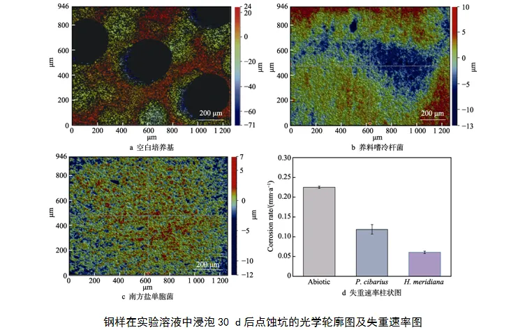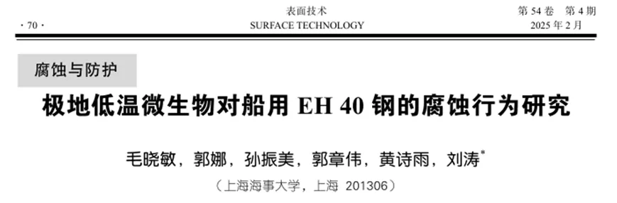 第一作者:毛晓敏 通信作者:刘涛教授 作者单位:上海海事大学 DOI:10.16490/j.cnki.issn.1001-3660.2025.04.005 船用合金钢在海水中的腐蚀问题不可避免,而极地海洋具有常年酷寒冰冻、光照辐射大、海冰层海水盐度高、微生物生理性质特异化等极端环境特点,会对极地船舶等服役设备在极地海水中的腐蚀造成未知的影响,其中微生物腐蚀(Microbiologically Influenced Corrosion,MIC)约占其中的20%。微生物腐蚀因其危害日益严重且作用机制复杂一直是腐蚀防护领域的研究重点。在服役过程中,船舶与其他海洋工程设施如海洋石油钻井平台和跨海大桥等都会遭受微生物的腐蚀侵害,会大大降低设备的服役性能,减少服役时间。面对极地地区严苛的生存条件,极地微生物也进化出了一套独特的生存机制,使其能够在极地极端环境下正常进行生长代谢遗传等生命活动。包括分泌在低温下也有高催化效率的低温酶、更复杂多样的胞外多糖(EPS)、冰结构蛋白、色素和抗菌物质等。大量具有特殊性质的胞外分泌物包裹着极地菌细胞分布在海冰和海水的交界处,会促进其附着于材料表面形成生物膜,从而对极地服役材料造成未知的腐蚀风险。因此要尽快开展极地微生物对船舶材料腐蚀行为和机理的研究。 为了研究极地低温菌及其代谢产物形成的生物膜对金属材料腐蚀行为的影响,选择了EH 40极地船舶用钢为实验金属材料,养料嗜冷杆菌Psychrobactercibarius(分离自E12°,S54°,2009)和南方盐单胞菌Halomonas meridiana(分离自E70.5°,S67.2°,2009)为实验菌种,研究了两株极地低温菌在4 ℃条件下对EH 40船用钢腐蚀行为的影响,初步分析了极地微生物的腐蚀机制,为船舶服役材料在极地环境中的评价提供理论支持。 毛晓敏, 郭娜, 孙振美, 等. 极地低温微生物对船用 EH 40 钢的腐蚀行为研究[J]. 表面技术, 2025, 54(4): 70-81.
