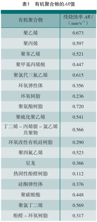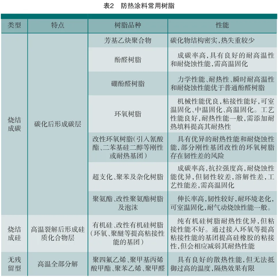早期的防热涂料是在聚氨酯、聚硫橡胶改性环氧树脂等弹性树脂中加入热分解填料,在快速加热过程中分解生成气体,以气泡的形式分散在树脂中,降低了树脂的热导率。80年代初研制的防热涂层采用较高Tg、热稳定性较好的双酚A环氧树脂,并在树脂中加入氧化铝、硼酸盐等填料,提高了涂层的环境使用温度。80年代末研制的第3代防热涂料已经具备了在超高音速下使用的性能。通过采用更高Tg、烧蚀后残炭率高的酚醛树脂、酚醛环氧及硅树脂等耐热树脂,使涂层能够经受短时、高热流下几个马赫数的气流冲刷。到21世纪初,通过采用具有更高耐热性、耐烧蚀性且具有一定韧性的改性有机硅树脂、有机硅及有机硅塑性弹性体等材料研制出能用于长时、高马赫数气流下的防热涂层。航天器在飞行过程中,大部分动能消耗在空气中(以激波和尾流漩涡的形式),只有少部分动能转变为热能。尽管真正以热的形式加热发动机的能量一般还不到其总动能的1%,但即使这样小的一部分能量,也足以使一般没有防热措施的导弹及其固体发动机很容易在大气中焚毁。因此外防热涂层的作用主要是使航天器在此类气动加热环境下免于发生过热或烧毁的耐高温、耐烧蚀外防护材料。外防热涂层最重要的性能是热性能,当前的导弹可长时间在稠密大气层中以超声速甚至高超声速飞行,因而带来异常严峻的气动热流挑战。烧蚀型外防热涂层在战术导弹防热系统中具有一定优势。抗气动冲刷性能是防热涂层的必备条件,尤其是经过高温高速气流冲刷后,防热涂层要具有良好的表面状态,表面要平整,且没有流挂现象。航天器在飞行过程中,大部分动能消耗在空气中(以激波和尾流漩涡的形式),只有少部分动能转变为热能。尽管真正以热的形式加热发动机的能量一般还不到其总动能的1%,但即使这样小的一部分能量,也足以使一般没有防热措施的导弹及其固体发动机很容易在大气中焚毁。因此外防热涂层的作用主要是使航天器在此类气动加热环境下免于发生过热或烧毁的耐高温、耐烧蚀外防护材料。外防热涂层最重要的性能是热性能,当前的导弹可长时间在稠密大气层中以超声速甚至高超声速飞行,因而带来异常严峻的气动热流挑战。烧蚀型外防热涂层在战术导弹防热系统中具有一定优势。抗气动冲刷性能是防热涂层的必备条件,尤其是经过高温高速气流冲刷后,防热涂层要具有良好的表面状态,表面要平整,且没有流挂现象。除必需具备高耐高温、耐烧蚀性外,外防热涂层还须具有良好的附着力、抗振动、抗冲刷、抗冲击性,还要具有低密度、低热导率、高比热容,使其具备良好的隔热性能、力学性能和热物理性能,以使其在高速冲刷下仍保持气动外形的完整性;烧蚀涂料的密度要小、以减轻弹体重量;此外涂料比热容应尽可能大,热导率应尽可能小,使烧蚀涂料兼具良好的隔热作用,以阻止热量传入弹体内部。此外,外防护涂层还需具备“三防”性能,高低温交变要求,以及适应战术导弹生产需要的工艺性能。目前,高温防热涂料大部分是以高聚物为基料,并加入填料、助剂研磨分散而成,有机高温防热涂层在高温下发生物理和化学吸热反应来达到隔热防护的目的。基体树脂对涂料性能起主导作用,基体树脂的选用将直接影响防热涂料耐热等级、对底材的粘接强度及抗冲刷性等。从聚合物热稳定性看,用于防热涂料的聚合物须具有高成碳性(最重要)、高耐热性、耐氧化和臭氧化性。从国内外烧蚀材料的研究和发展上看,目前广泛采用以硅橡胶、酚醛树脂和酚醛环氧树脂为基体材料。酚醛树脂和酚醛环氧树脂制成的涂料碳化率高、热导率低、比热容大、隔热性好,适用于中等热流的烧蚀环境,但高温剪切强度低,抗高速气流冲刷能力较差。硅橡胶制成的涂料固化后为弹性体烧蚀材料,适用于低热流、低剪切力下的烧蚀环境,在高热流、高剪切力情况下烧蚀严重。含有芳基结构、杂原子环和杂稠环状结构的基体树脂具有更好的耐热性和耐烧蚀性。几种有机聚合物基体树脂的线烧蚀率(AR)值见表1,常用于防热涂料的基体树脂见表2。其中,抗氧剂能对以上氧化作用产生抑制,因而被广泛使用。