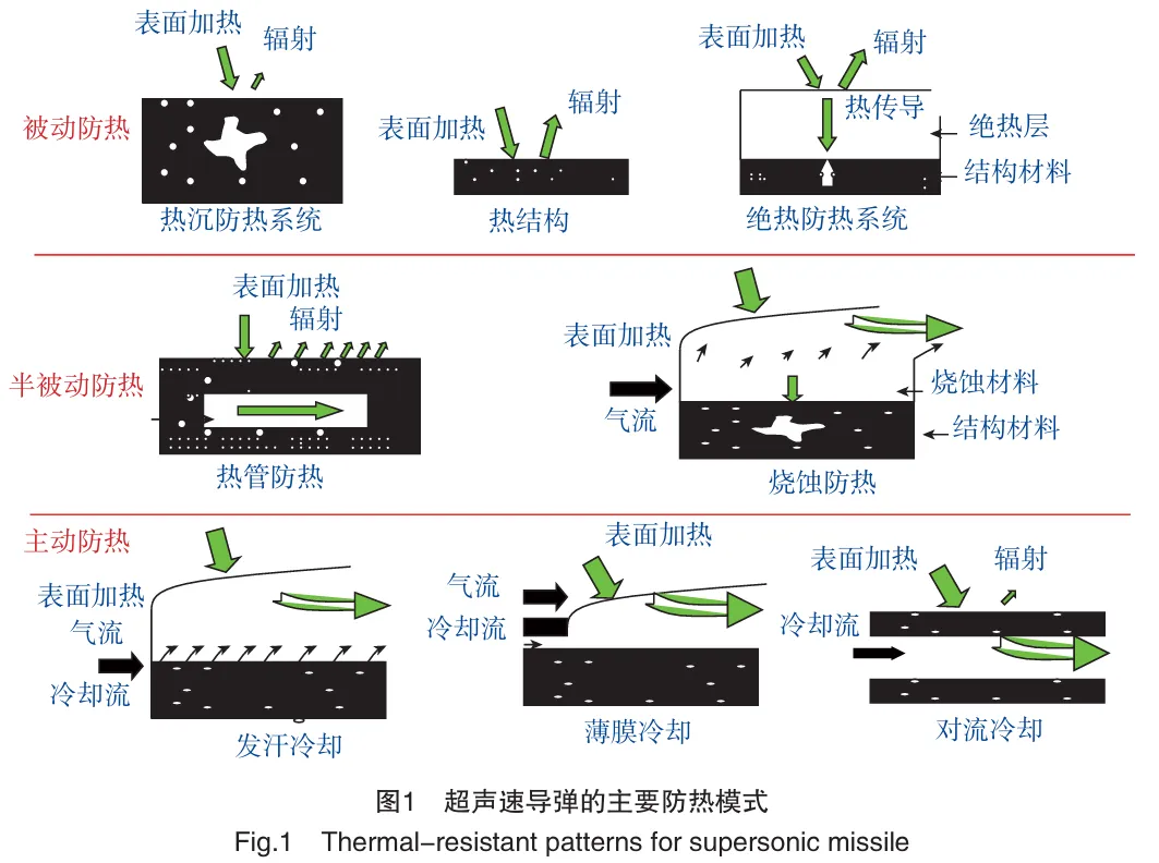 外防热涂层通过采用在使用温度下分解并会挥发的填料和具有降低密度且提高隔热性能的中空轻质填料。因导弹飞行器各部位气动热流量不同,同一导弹需要采用多种防热涂层系统。工业界曾对这些工作模式提出多种分类方式,美国航空航天局归纳为3种模式8种防热系统。这3种模式根据是否使用降温工质来分类,即被动防热、半主动防热、主动防热。被动防热不使用降温工质;半主动防热使用降温工质,但不需外加设备;主动防热使用工质、并需要外加设备来提供或循环该工质以实现连续降温。相应8种防热系统分别是:热沉防热系统、热结构、绝热防热系统、烧蚀防热,热管防热、发汗冷却、薄膜冷却、对流冷却。图1是各种防热模式和防热系统示意图。按这种分类,现使用的典型隔热材料主要有陶瓷隔热瓦、陶瓷纤维隔热毡及轻质烧蚀防热材料等。战术导弹高速飞行产生高速气流对涂层和壳体产生气动加热,既与材料自身耐热性有关,又与应用环境中发生的化学、物理反应相关。设计外涂层材料时要根据气动环境下材料烧蚀防热机理,充分考虑材料与实际气动环境配合程度。