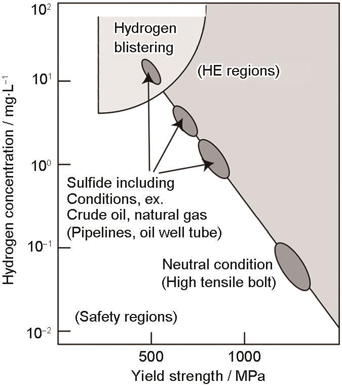 图1 钢发生氢脆的临界氢浓度与屈服强度之间的关系[32]