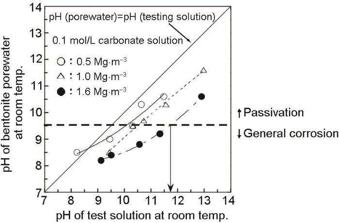 溶液饱和的膨润土中不发生阳极钝化。随后,Taniguchi等[13]将碳钢电极试样安装在用上述pH = 10的测试溶液饱和的、不同干密度的膨润土中,结果显示,碳钢只在最低干密度为0.5 mg/m3的膨润土中发生钝化,而在1.2~1.8 mg/m3的较高干密度的膨润土中不发生钝化,如图4所示。这说明与测试溶液的水化学相比,测试溶液饱和的膨润土孔隙水的水化学可能发生了改变,从而影响了碳钢的腐蚀行为。Taniguchi等[51]进一步研究了可以使碳钢由均匀腐蚀向钝化转变的缓冲材料(70%膨润土和30%石英砂的混合物)孔隙水的pH,以及溶液pH、缓冲材料干密度和缓冲材料孔隙水pH之间的关系。试验的统计学规律表明,碳钢一般在缓冲材料孔隙水pH大于等于9.5的环境中发生钝化,且缓冲材料孔隙水的pH随着干密度的增加而降低,如图5和6所示[51]。为使碳钢在干密度为1.6 mg/m3的缓冲材料中发生钝化,用于饱和缓冲材料的地下水pH应大于11.5 (图6所示)。Wieland等[57]研究表明,缓冲材料孔隙水的pH降低可能是氢离子从蒙脱石边缘的羟基中解离造成,并且这种现象随膨润土的干密度增加而更加明显[22,38]。在日本,较高CO