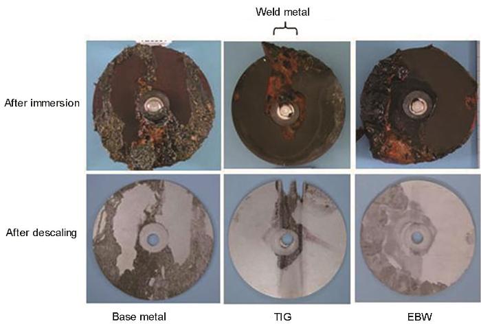 溶液中发生应力腐蚀开裂,但是这种应力腐蚀开裂与材料采用的热处理工艺有关。Kasahara和Adachi[48]研究了热处理和焊接工艺对钢应力腐蚀开裂敏感性的影响,表明热处理导致的金属微观组织的改变会影响金属的应力腐蚀开裂敏感性。除应力腐蚀开裂外,焊接还可能加速金属的腐蚀损伤[37]。因此,有必要考虑处置容器罐体和顶盖之间的密封方式和焊接参数(热输入和冷却速度等),确定焊接部位的腐蚀行为及其对应力腐蚀开裂敏感性的影响。日本拟通过选择合适的焊接和热处理工艺、参数和严格的质量控制措施,获得与处置容器罐体耐蚀性相当的焊接部位,降低碳钢作为处置容器发生应力腐蚀开裂的风险。