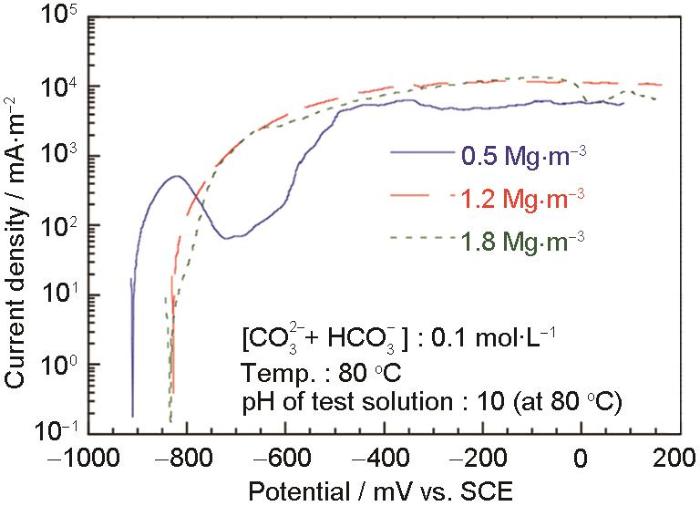 Fig.4 Anodic polarization curves of carbon steel in bentonites with different dry densities and saturated by the solutions with pH value of 10[13]