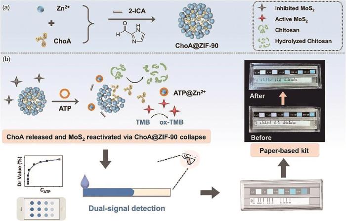 Fig.4 Schematic diagrams of the preparation of ChoA@ZIF-90 (a) and paper-based ATP assay based on MOFs regulated degradation of high viscosity hydrogel and nanozyme reactivation for ATP detection (b)[53]