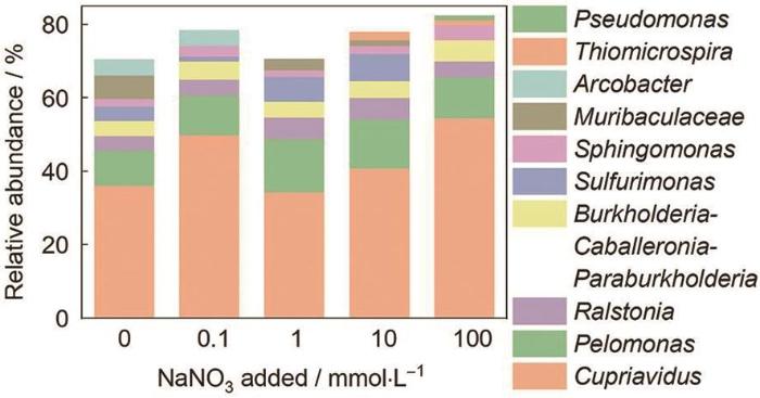 Fig.2 Histogram of microbial communities on EH40 steel immersed for 12 weeks in seawater containing different concentrations of nitrate[30]
