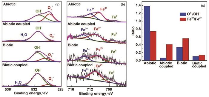 图3 去除生物膜后2205不锈钢表面钝化层的O 1s、Fe 2p XPS谱图、O2-/OH-和Fe3+/Fe2+的相应比率[37]