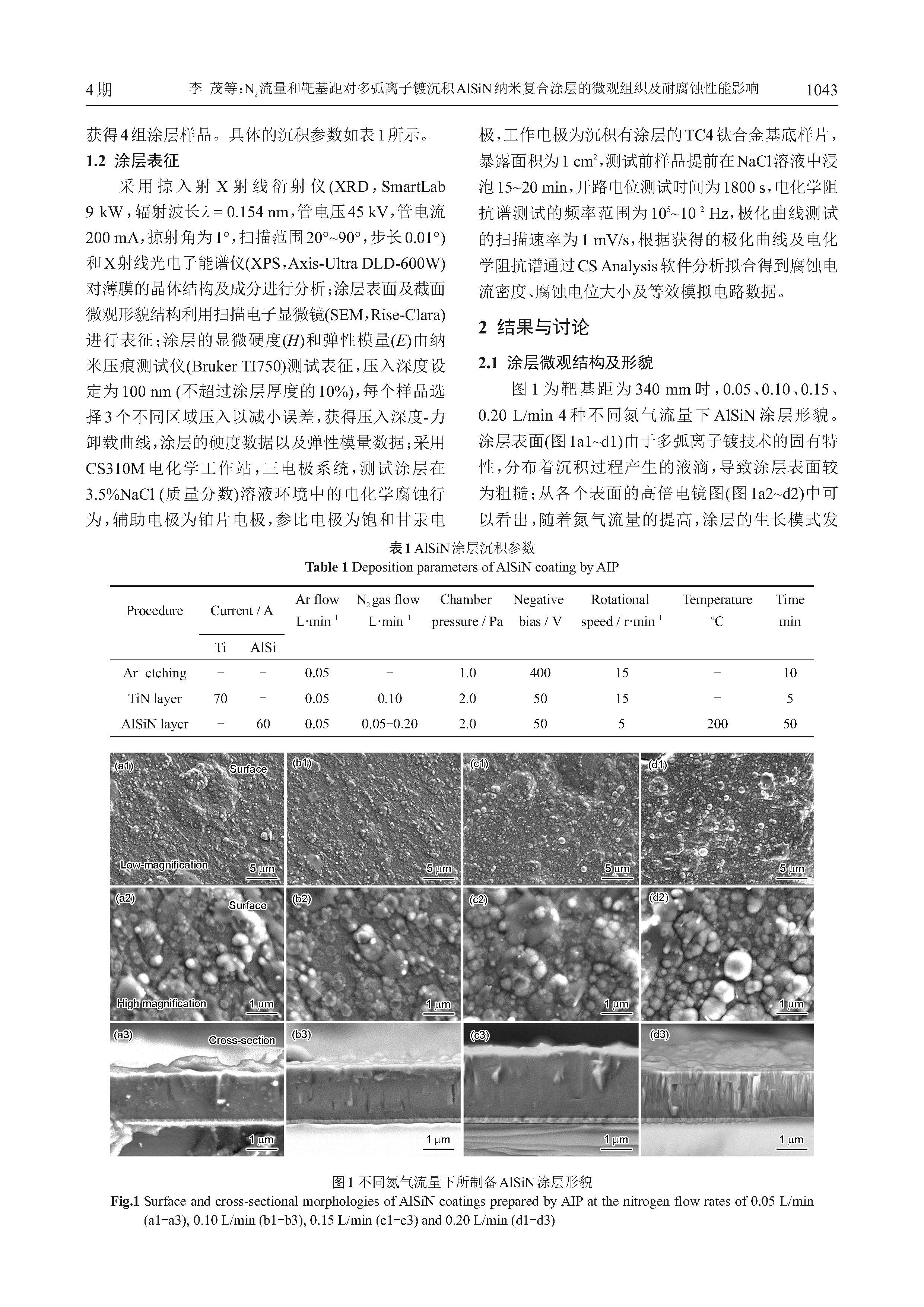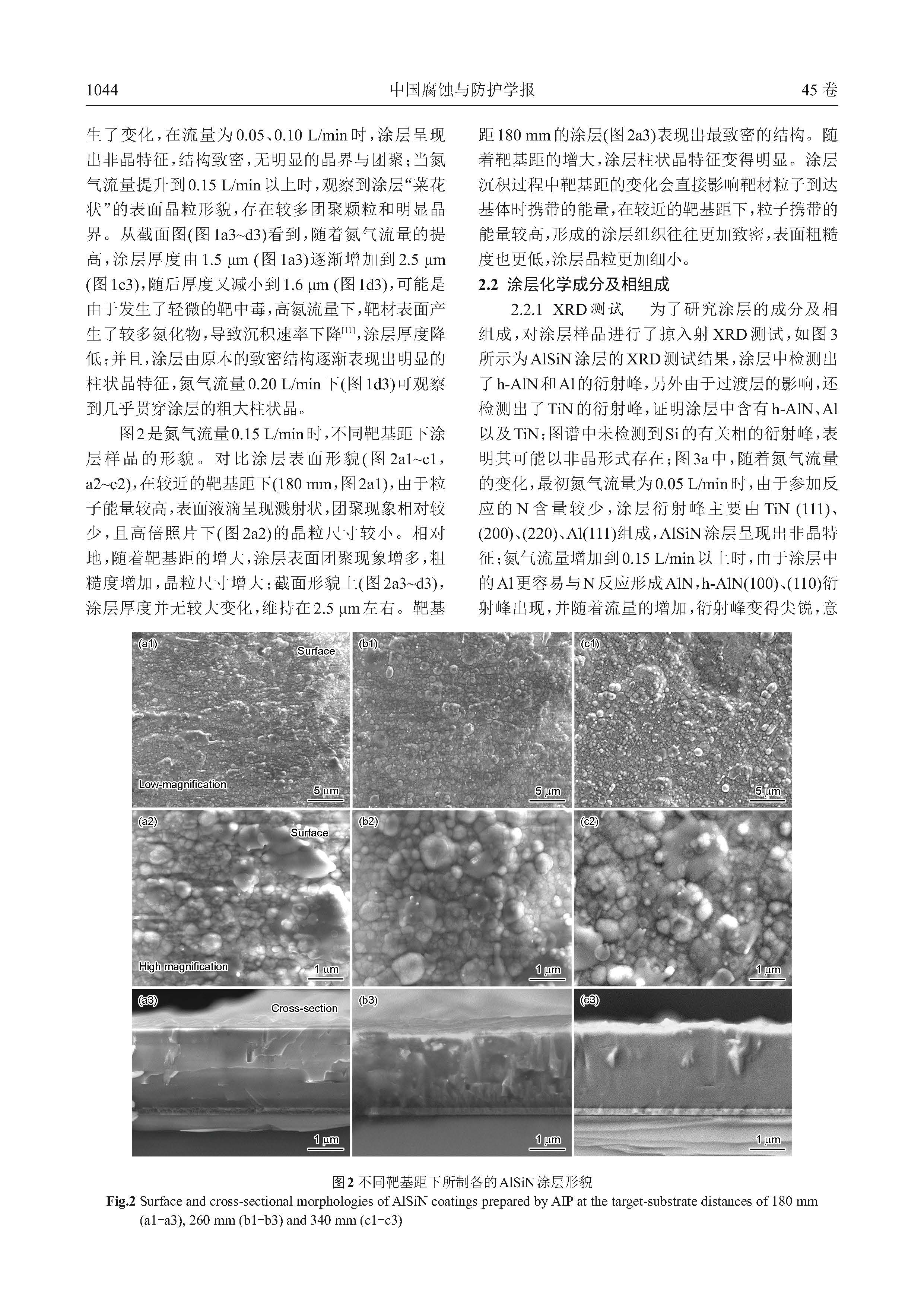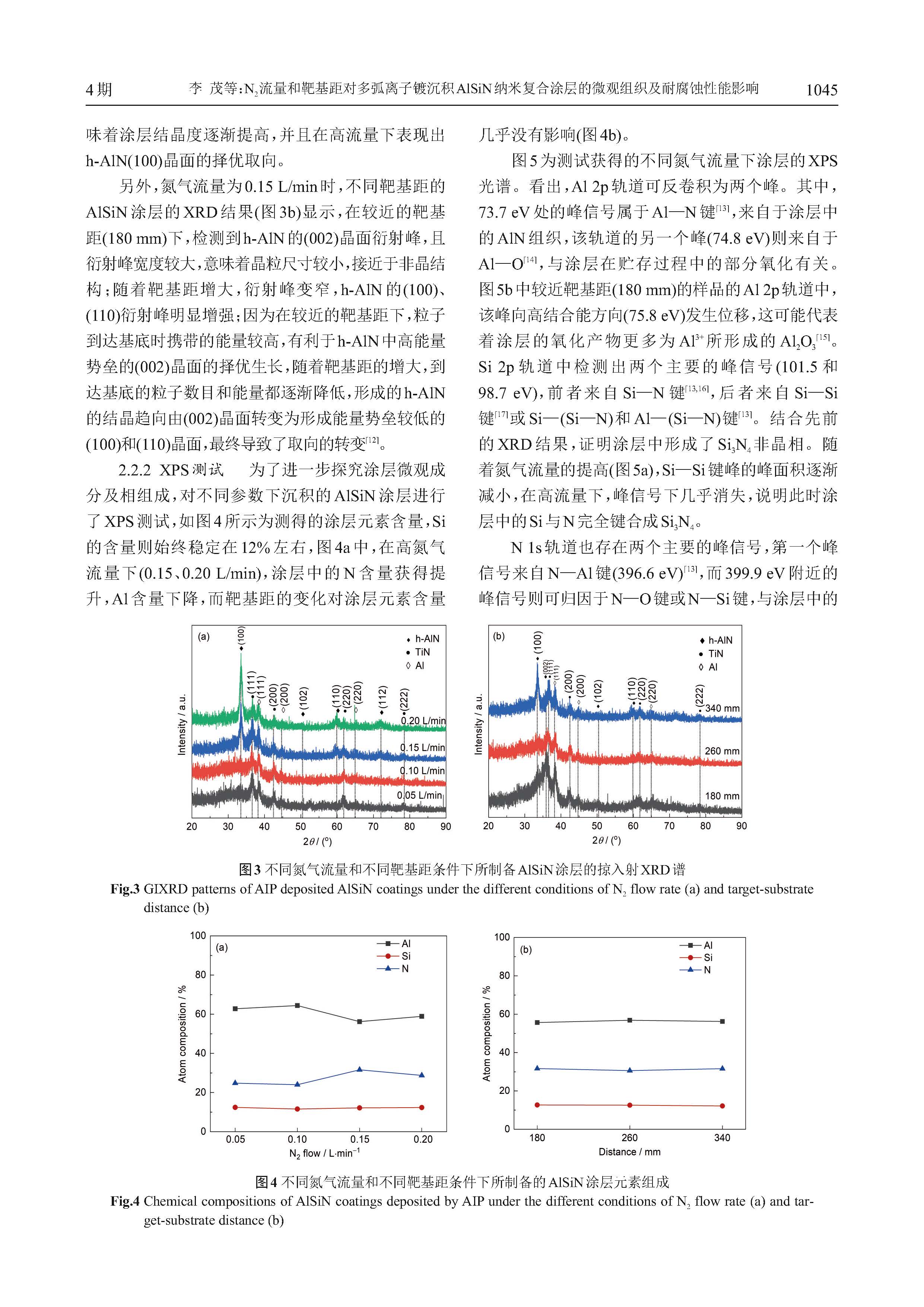 N2流量和靶基距对多弧离子镀沉积AlSiN纳米复合涂层的微观组织及耐腐蚀性能影响