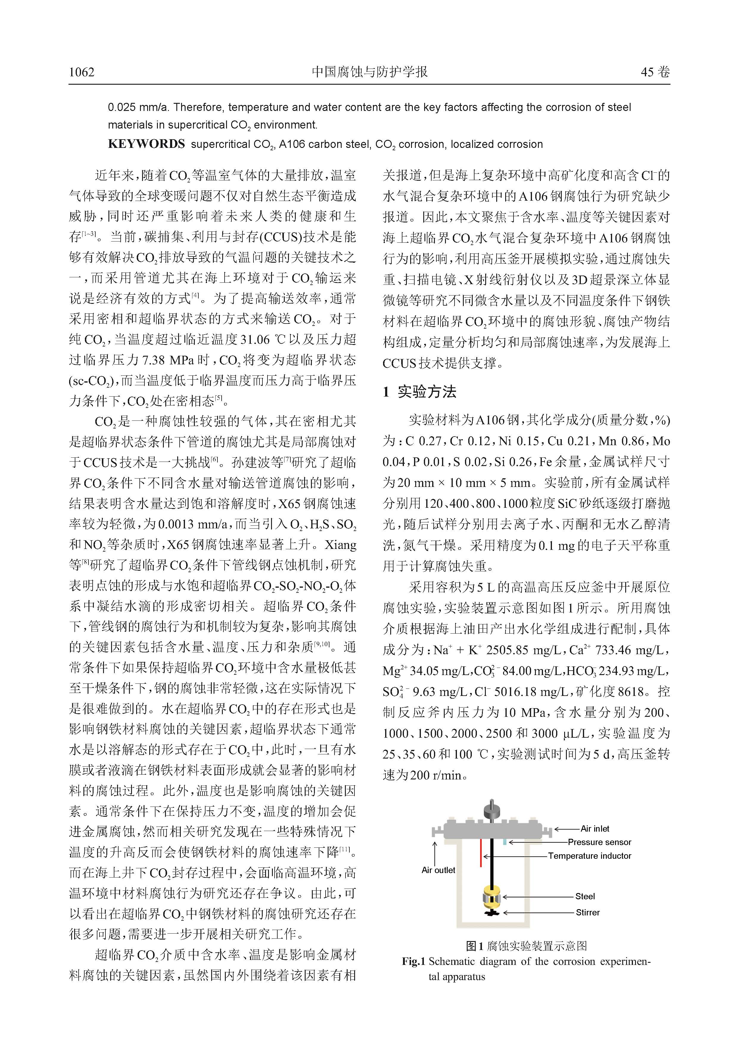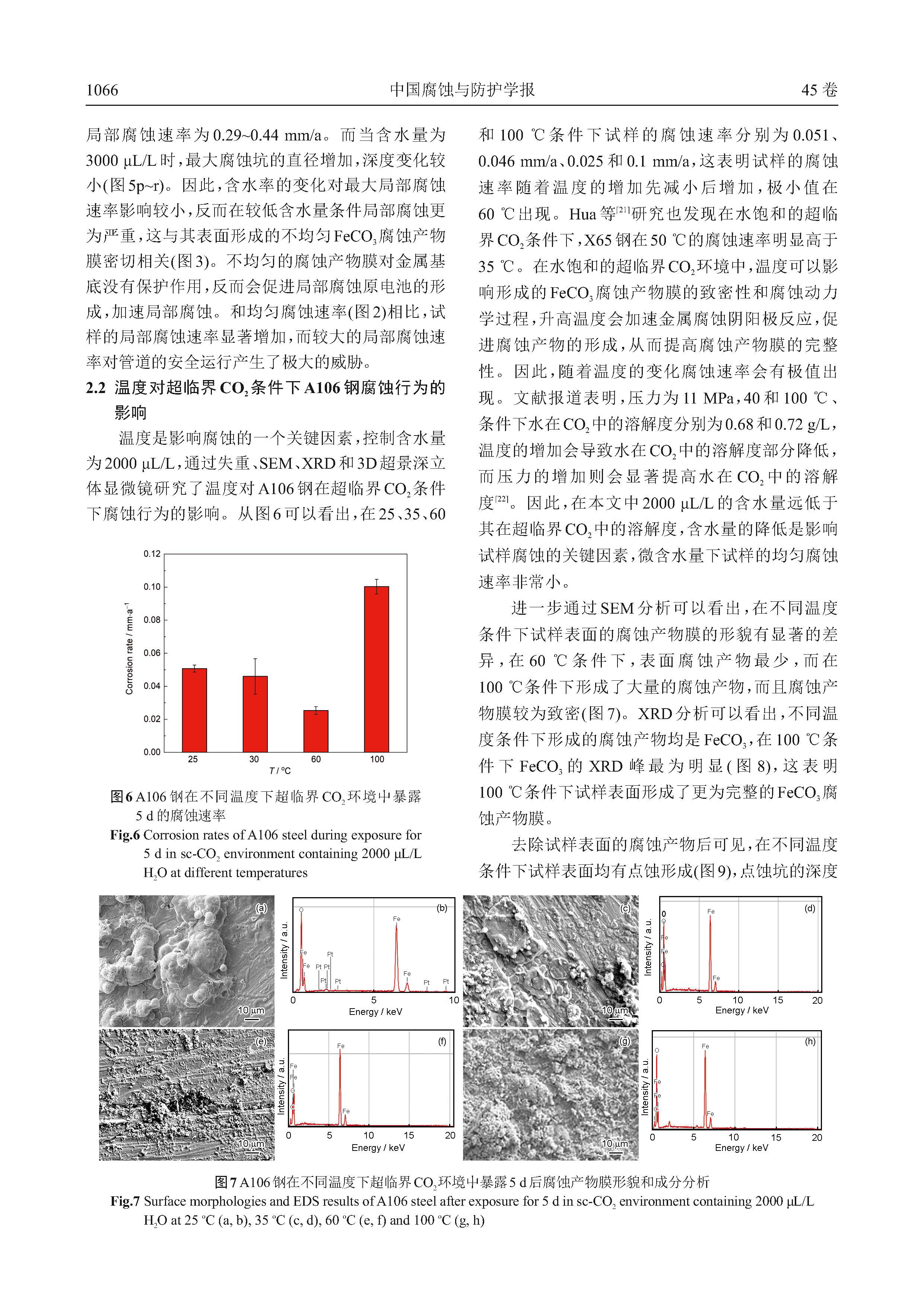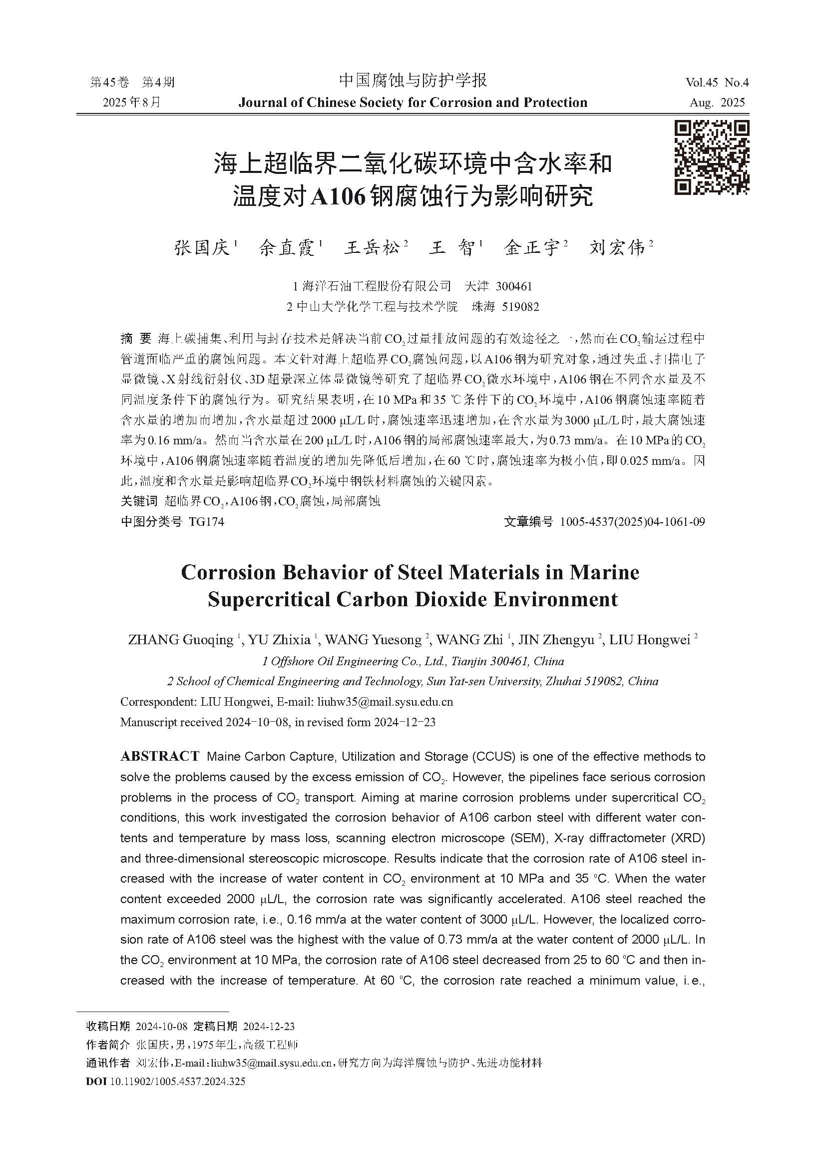 海上超临界二氧化碳环境中含水率和温度对A106钢腐蚀行为影响研究