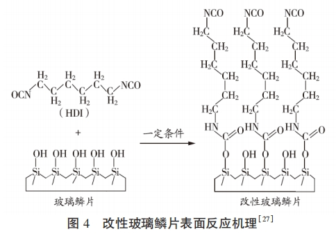 环氧玻璃鳞片涂层是以无机玻璃鳞片材料改性环氧树脂涂料所制备的一种复合涂层,复合涂层具有高附着力和机械强度,也具有很好的耐腐蚀性能和装饰性。玻璃鳞片于上世纪50年代由美国公司首先应用于环氧涂料来提升其防腐性能,我国在上世纪80年代初期开始引人该技术并开展环氧鳞片涂层的研发和性能研究。颜晨曦等人通过硅烷偶联剂KH570对玻璃鳞片表面进行改性,并以改性后的玻璃鳞片作为填料加入到环氧树脂涂料中制备了玻璃鳞片/环氧复合涂层,显著提高了环氧涂料的耐腐蚀以及抗渗透性能,结果显示加入含量30%改性玻璃鳞片的复合涂层在经1000h盐雾实验后仅发生轻微腐蚀,其水分子的扩散系数也有所下降;李婷等人采用表面接枝法以六亚甲二异氰酸酯改性无机玻璃鳞片(见图4),再与环氧树脂进行复合制备了改性玻璃鳞片防腐涂料,并对涂料的力学以及防腐性能进行了表征测试,测试结果表明六亚甲二异氰酸酯作为表面改性介质有效提高了玻璃鳞片与环氧树脂之间的结合力,这使得所制备的复合涂层耐冲击性、拉伸性能、防腐性能等均得到显著提高;张瑞珠等人通过协同增强的方式添加玻璃鳞片和改性纳米二氧化硅制备了一种新型二氧化硅/玻璃鳞片环氧基复合涂层,所制备涂层的韧性和致密性有显著提高,在硬度上也相较纯环氧涂层提高了57.7%,磨损失重和摩擦系数相较纯环氧涂层减少了57.0%和49.3%。