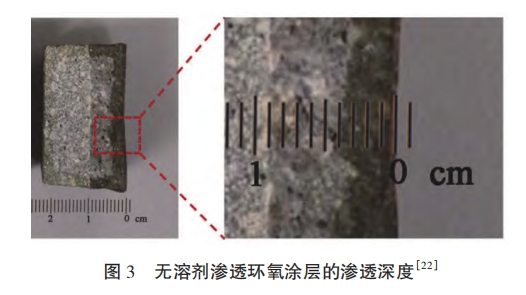 通过反应性溶剂对环氧树脂进行稀释制备的无溶剂环氧树脂涂层不仅可以降低涂料在固化过程中的溶剂挥发,还可以减少环氧材料的固化收缩,增强环氧涂层的力学性能和耐腐蚀性能。张国梁等人利用糠醛/丙酮混合溶液作为反应型溶剂与环氧树脂混合制备了一种新型无溶剂环氧树脂涂料,制备的涂料可渗人到混凝土表面孔隙并在固化后填堵孔隙(见图3),在提高混凝土耐腐蚀性能的同时,大大增强了涂层与基底的粘结性能,性能测试结果表明,涂层的拉拔强度相较混凝土提高了130%,表面电通量由3400C下降到130C,抗离子渗人能力大大提高;牟迪等人以一、二、三官能度缩水甘油醚为活性稀释剂,自制腰果酚改性酚醛作为固化剂与环氧树脂混合制备了无溶剂环氧树脂涂层,制备的涂层抗冲击性能达50kg·cm,在强酸碱溶液中浸泡100d涂膜依然保持有很高的完整性。