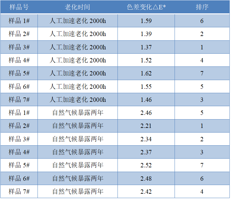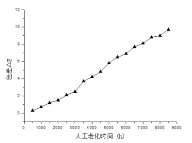 图1 涂膜失光率随人工老化时间的变化 从图1中可以看出,钢结构防腐涂料老化3000h后失光率为8%,失光等级为1级。随着老化时间的继续延长,钢结构防腐涂料在老化6000 h时,失光率达到52%,出现严重失光,失光等级达到4级。 图2 涂膜失光率随自然老化时间的变化 图2为自然老化过程中涂层失光率的变化情况,从图2中可以直观的看出,钢结构防腐涂料在陆河自然暴晒场自然老化一年后出现了1级很轻微的失光。当自然老化两年后,钢结构防腐涂料出现轻微失光,失光率达到11%,失光等级为1级。钢结构防腐涂料的自然老化规律均表现出和人工加速老化相似的老化规律。 2.2老化前后涂层色差的变化 对人工加速老化9000h后建筑外涂涂料涂层的色差进行考察,每500小时测量一次,结果如图3所示。 图3 涂层色差随人工老化时间的变化曲线 从图3中可以看出,氙灯老化1000 h的钢结构防腐涂膜试板的色差△E*为0.7,失光等级无变化,都为0级,说明钢结构防腐涂膜具有耐老化性能。当氙灯老化时间达到8500 h时,钢结构防腐涂料的色差△E*为9.7,变色等级已达到4级,涂层表面出现较大失光,涂层失效。 图4 涂膜色差随自然老化时间的变化曲线 图4为涂膜色差随自然老化时间的变化曲线,从图4中可以看出,钢结构防腐涂料老化自然气候老化两年后色差△E*为5.2,变色等级为2级轻微变色。钢结构防腐涂料的耐老化性相对较弱。在自然气候老化出现中出现和氙灯人工加速老化相似的规律。 2.3自然暴晒和人工老化相关系数的计算 根据样品在自然气候暴露试验中的太阳辐照总量(表1中的总辐照量)与人工加速老化试验中的辐照度,计算太阳辐照度相等的情况下,自然暴晒两年相当于实验室中人工加速老化试验的时间,计算公式如公式1所示: 公式1中,Ti为人工加速老化试验的时间,单位为小时(h);Hg为自然气候暴露试验中的太阳辐照总量,单位为焦每平方米(MJ/m2 );R为温度修正系数;60%为300~800 nm的波长范围内太阳辐照量所占总辐照量的百分数;Ei为氙灯老化试验箱使用Boro/Boro滤镜组合时,其发射的光谱波长范围在300~800nm的辐照度,单位为瓦每平方米(W/m2);3600秒=1小时。 监测两年的太阳辐照总量Hg=(4926+4883)×106 J/m2;温度修正系数R=67%;氙灯光照辐射强度Ei=550 W/m2;计算得到Ti=1991.7 h;即得到实验室人工加速老化1992小时相当于湿热气候环境中的自然暴露两年,实验室人工老化996小时相当于广东地区气候环境中暴晒老化一年。不同涂料类型是否能够应用这一计算公式推断其实验室人工老化996小时相当于户外自然暴晒一年,还需计算不同涂料类型这两个老化试验方法之间的相关系数。 根据所得评估结果的数据,计算钢结构防腐涂料自然户外曝晒与氙灯试验室加速测试方法之间的相关系数(spearman)。该相关系数是通过两中不同的老化方法对同一种试验进行测试所得试验结果之间的相关性,并计算自然气候暴露和人工加速老化试验的相关系数,计算公式如公式2所示: 公式2中,rs为相关系数;n为人工加速老化试验(X)和自然气候暴露试验(Y)这两个因素各自的元素个数,即试验的样品重复数;di为两个因素(X、Y)中每一个样品按升幂排序后 Xi、Yi的排位数之间的差值;rs的绝对值越接近1,两种老化试验方法的相关性越强。按照上述公式1中计算得出的实验室老化大约2000小时相当于自然气候暴晒两年,再根据上节中结果,钢结构防腐涂料人工老化2000 h后的色差变化△E*为2.5,自然暴晒老化两年后的色差变化△E*为2.6。每种老化试验方法各投七个平行样,每个样品的色差变化△E*的数据结果和排序如表1所示。 表1 钢结构防腐涂料人工加速和自然暴露后的色差变化△E*排序表 结合表中数据依据公式2所述的spearman相关系数的计算公式 rs=1-6×[(6-5)2+(2-1)2+(1-2)2+(4-3)2+(7-7)2+(5-6)2+(3-4)2]/7×(72-1) =0.89,得出自然气候暴露和人工加速老化试验的相关系数rs为0.89,同理得到,996×0.89=886小时,对于钢结构防腐涂料,实验室内人工加速老化886小时相当于广东地区自然气候中暴晒老化一年。 3 结论 钢结构防腐涂料同时进行自然气候老化试验和人工加速老化试验,实时监控老化过程,每个检查周期内对涂层宏观性能的数据结果进行测定,根据两种老化试验的数据结果,计算得出涂料自然户外曝晒与实验室人工加速测试方法之间的相关系数为0.89,表明人工老化与自然暴露的结果相关性比较好,即钢结构防腐涂料的实验室内人工加速老化大约886小时相当于自然气候暴露一年。这种研究方法为耐候性涂膜老化方法研究提供技术基础,对改善涂料的生产技术和提高涂料的应用价值等提供的技术指导,也为建立实验室与户外自然暴晒试验的相互对比和预测涂料使用寿命提供基础依据。